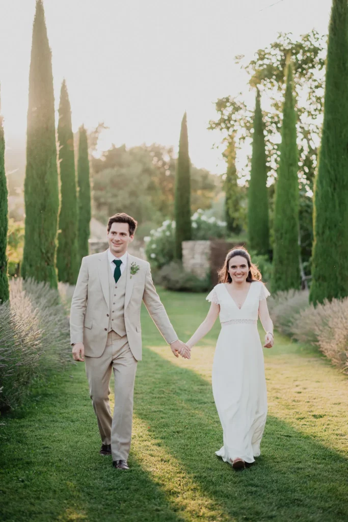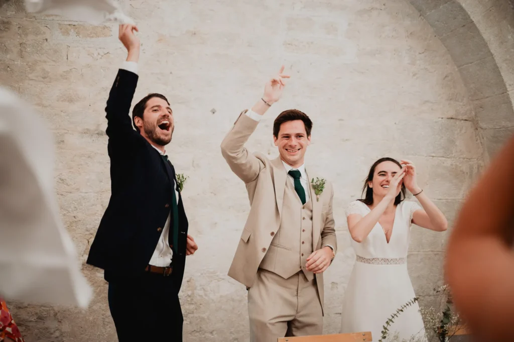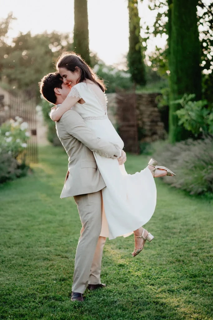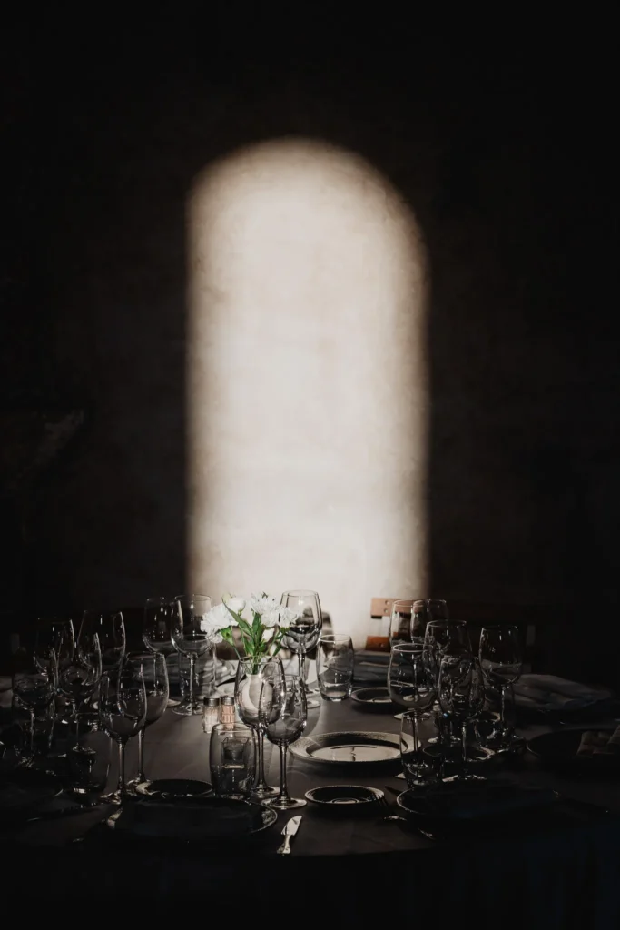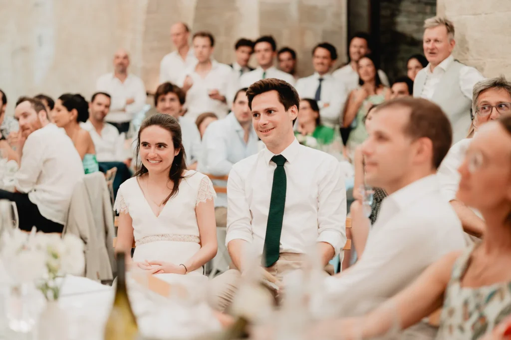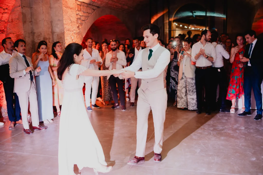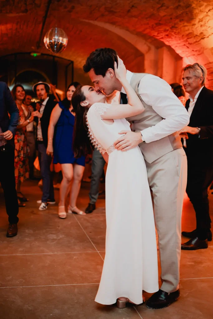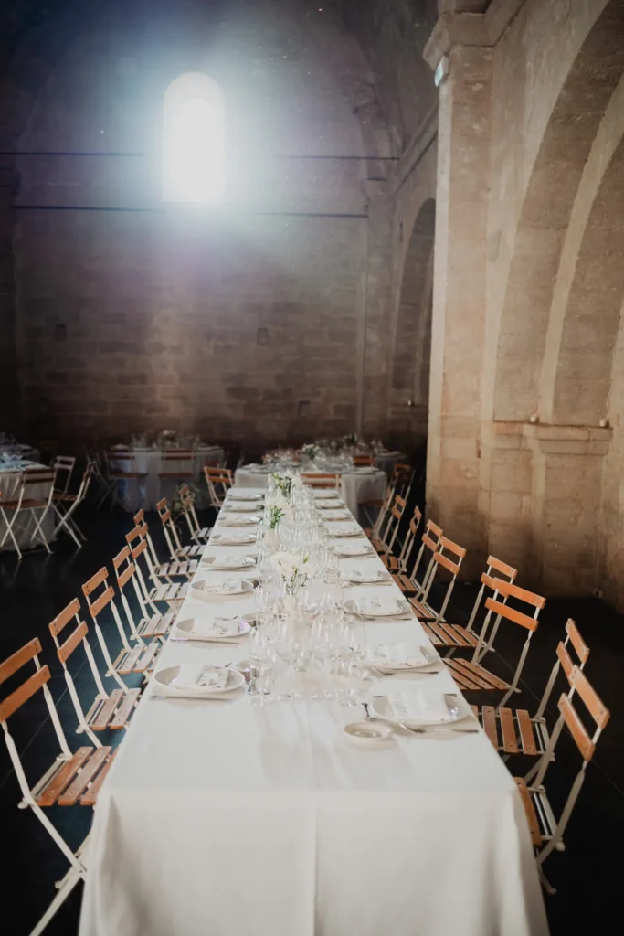À l’Abbaye de Saint-Eusèbe, tout commence dehors : une arrivée progressive des invités, puis cette ambiance très particulière du lieu, avec l’allée de cyprès et les lavandes qui bordent les jardins. La cérémonie laïque se tient en extérieur, sur la pelouse, dans une atmosphère simple et attentive, on sent que l’endroit est pensé pour laisser de la place aux voix, aux regards et aux silences. Après la cérémonie, le cocktail se prolonge dans les jardins, à l’ombre des cyprès, pendant que les groupes se forment et se défont naturellement. C’est aussi le moment idéal pour la séance couple : quelques minutes à l’écart, entre cyprès, lavande et pierre claire, avec une lumière de fin de journée qui se glisse entre les arbres et donne aux images un côté très doux, sans avoir besoin d’en faire trop. Le repas se déroule ensuite à l’intérieur de l’abbaye, dans un espace marqué par la pierre et les voûtes — un décor qui change immédiatement le rythme : plus posé, plus intime, très “abbaye”. Puis la soirée bascule dans un espace voûté plus souterrain (type crypte), parfait pour la fête : lumière plus basse, boule à facettes, et cette sensation d’être “dans” le lieu, jusqu’au bout de la nuit.