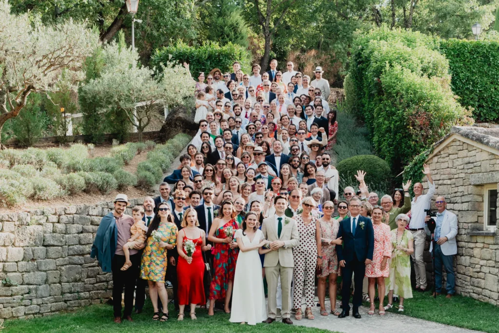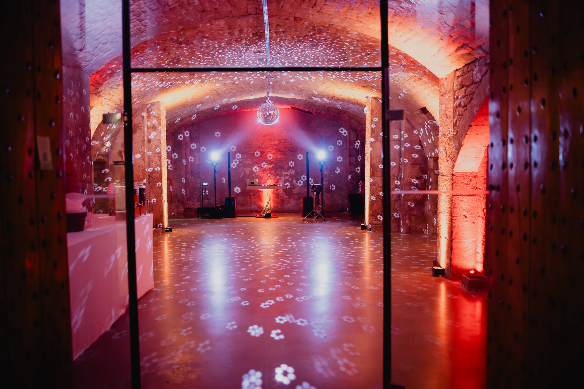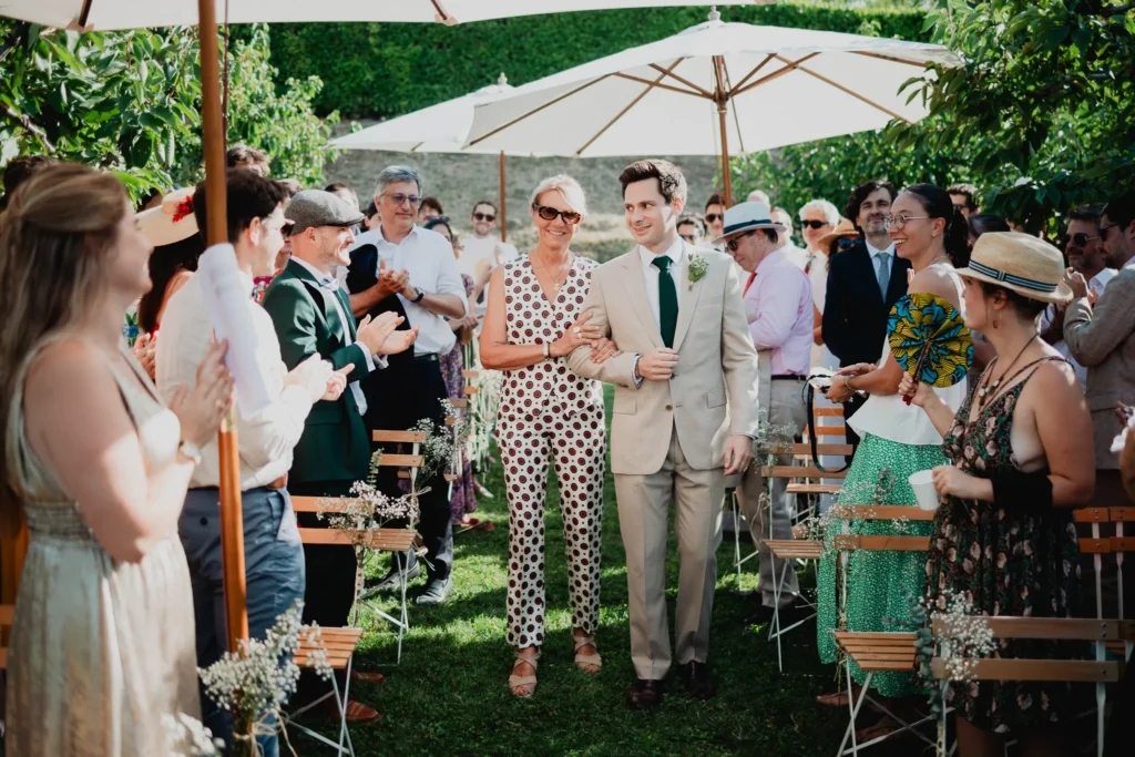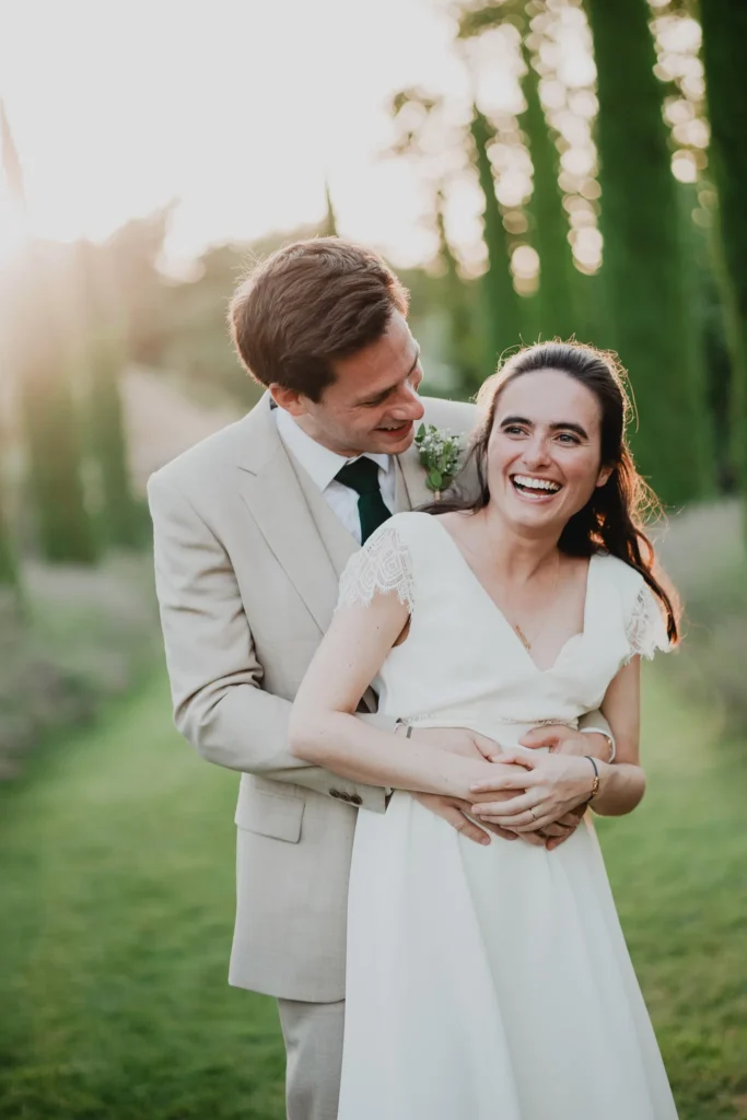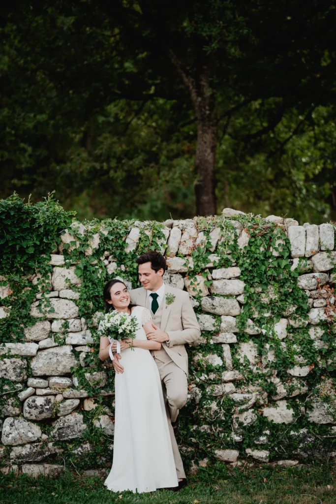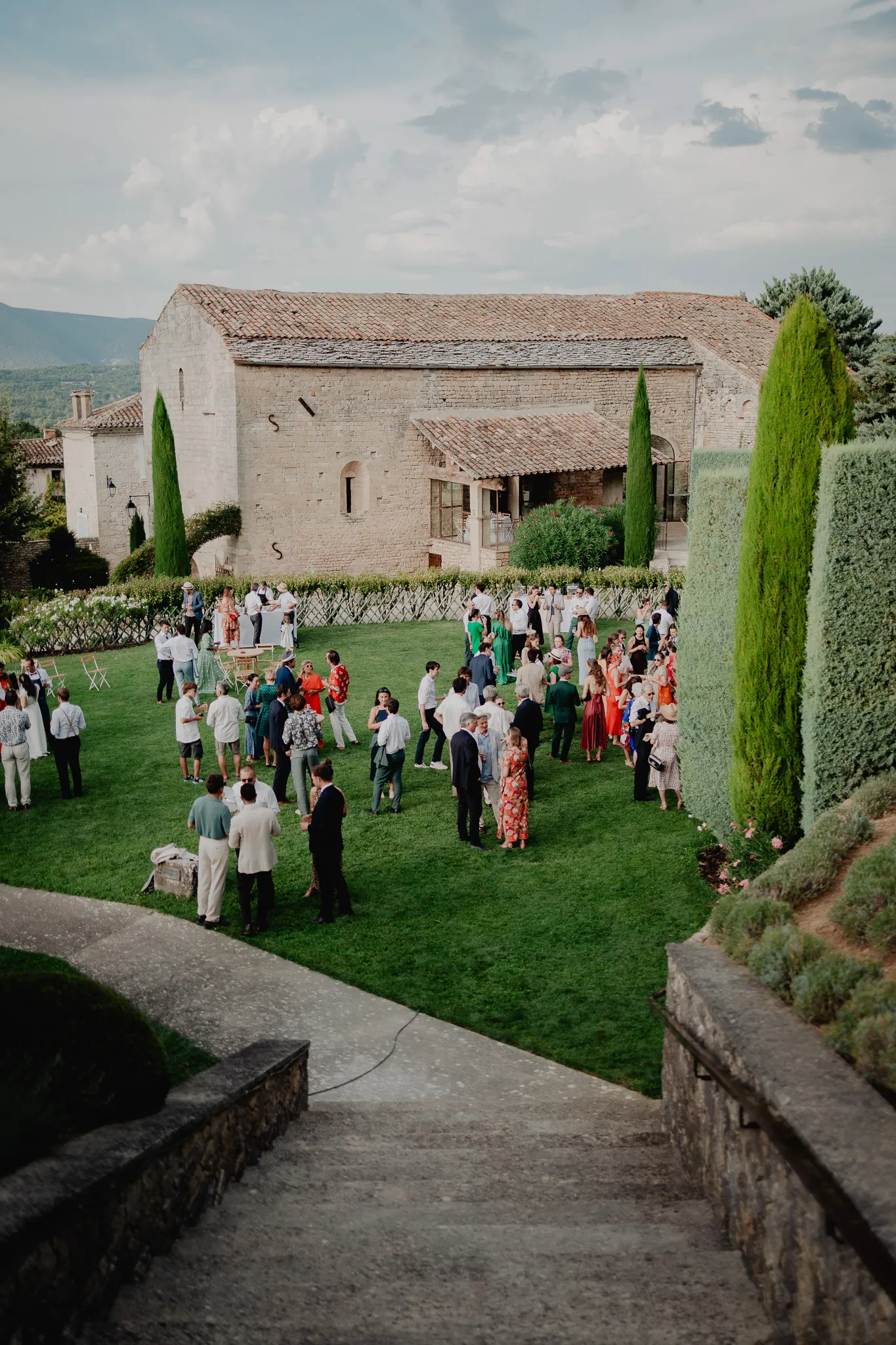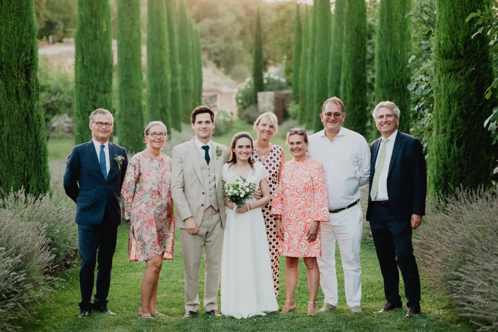 À l’Abbaye de Saint-Eusèbe, tout commence dehors : une arrivée progressive des invités, puis cette ambiance très particulière du lieu, avec l’allée de cyprès et les lavandes qui bordent les jardins. La cérémonie laïque se tient en extérieur, sur la pelouse, dans une atmosphère simple et attentive, on sent que l’endroit est pensé pour laisser de la place aux voix, aux regards et aux silences. Après la cérémonie, le cocktail se prolonge dans les jardins, à l’ombre des cyprès, pendant que les groupes se forment et se défont naturellement. C’est aussi le moment idéal pour la séance couple : quelques minutes à l’écart, entre cyprès, lavande et pierre claire, avec une lumière de fin de journée qui se glisse entre les arbres et donne aux images un côté très doux, sans avoir besoin d’en faire trop. Le repas se déroule ensuite à l’intérieur de l’abbaye, dans un espace marqué par la pierre et les voûtes — un décor qui change immédiatement le rythme : plus posé, plus intime, très “abbaye”. Puis la soirée bascule dans un espace voûté plus souterrain (type crypte), parfait pour la fête : lumière plus basse, boule à facettes, et cette sensation d’être “dans” le lieu, jusqu’au bout de la nuit.