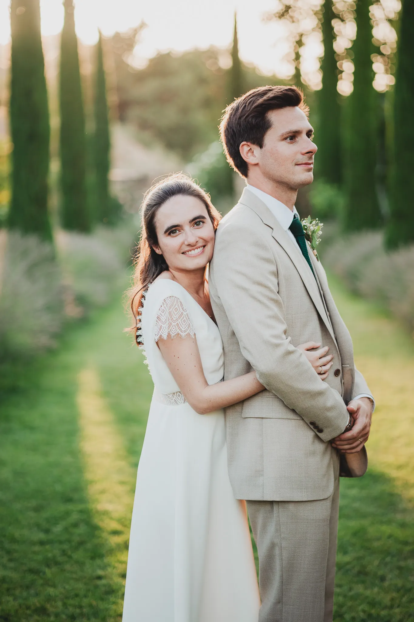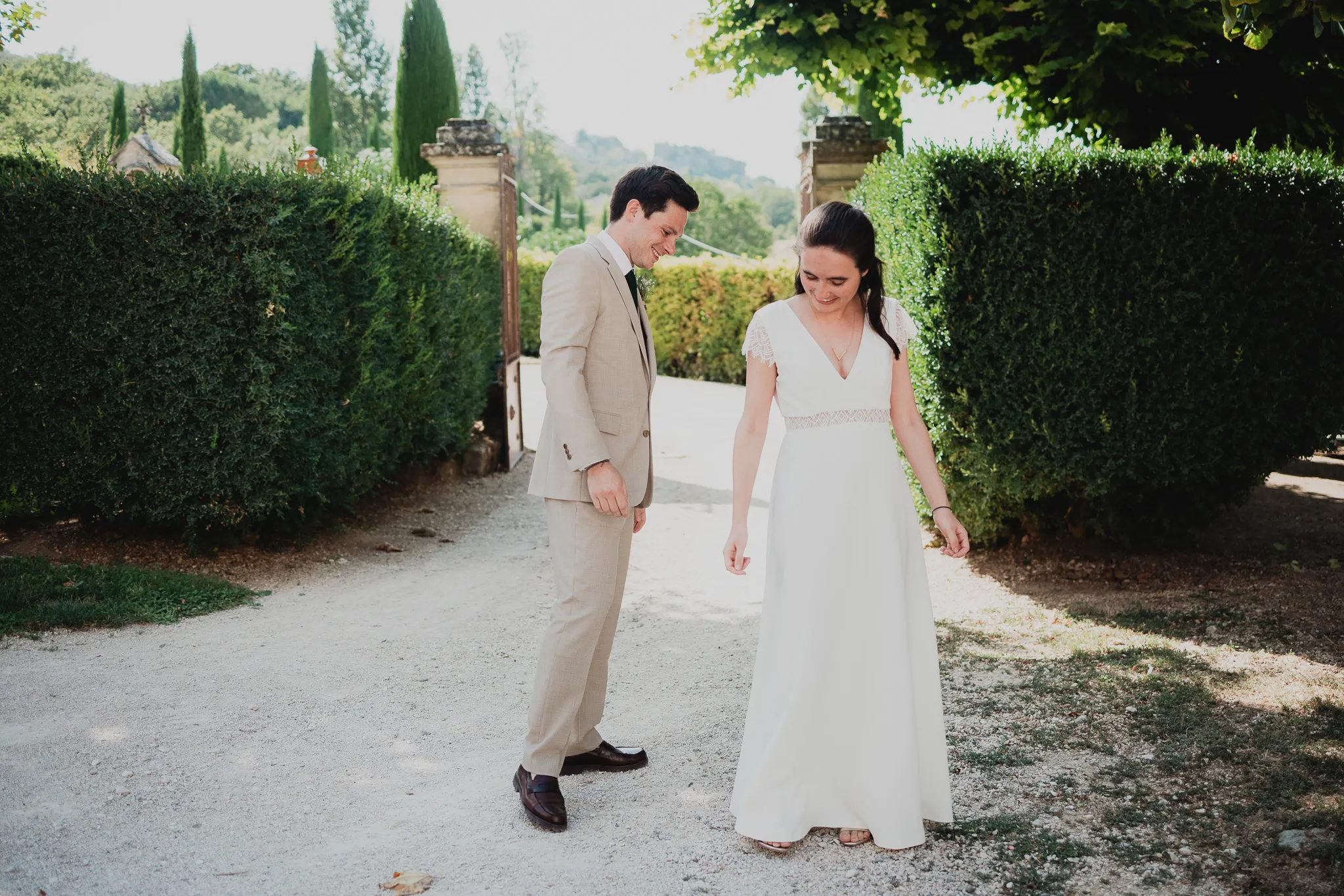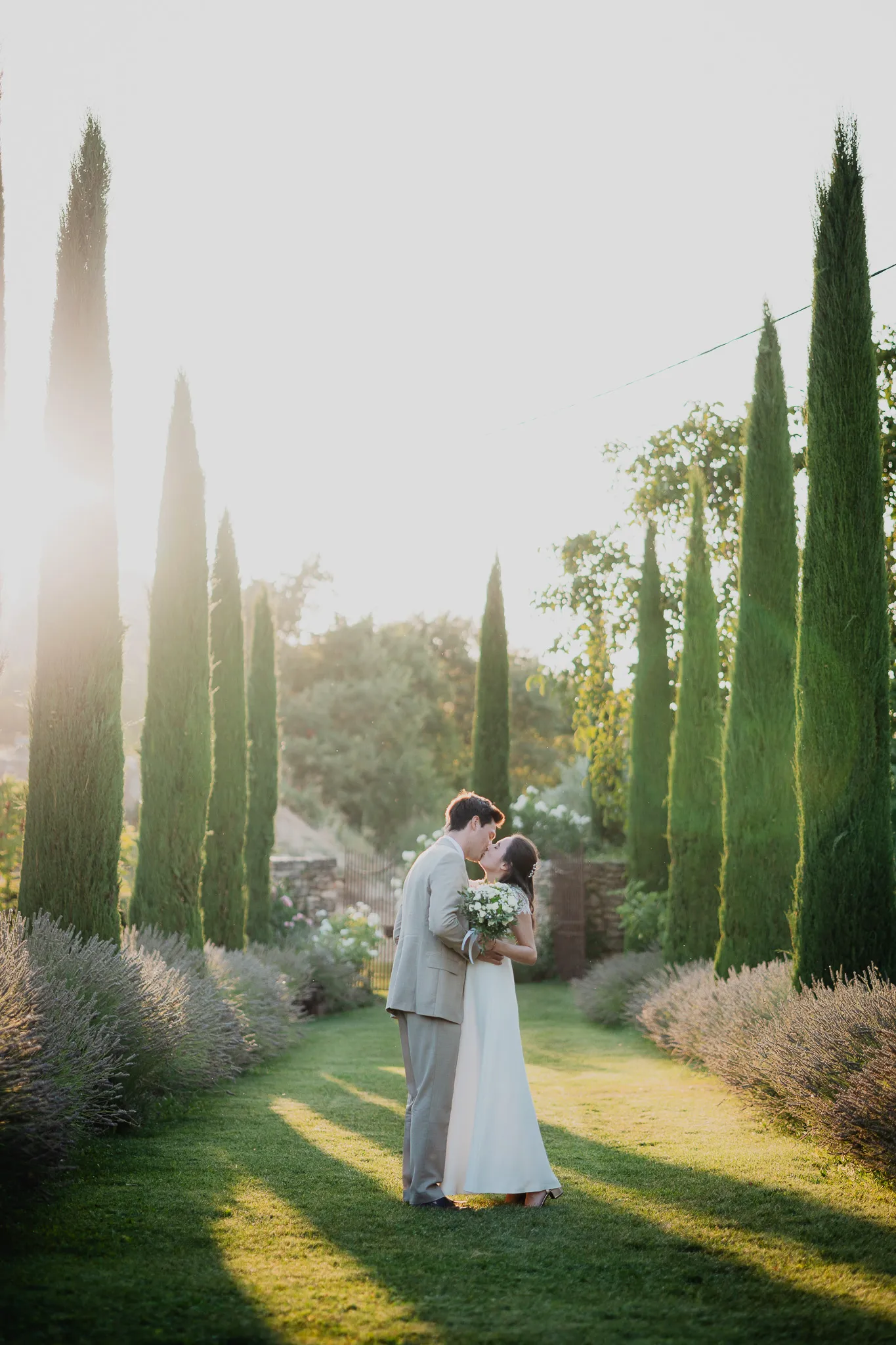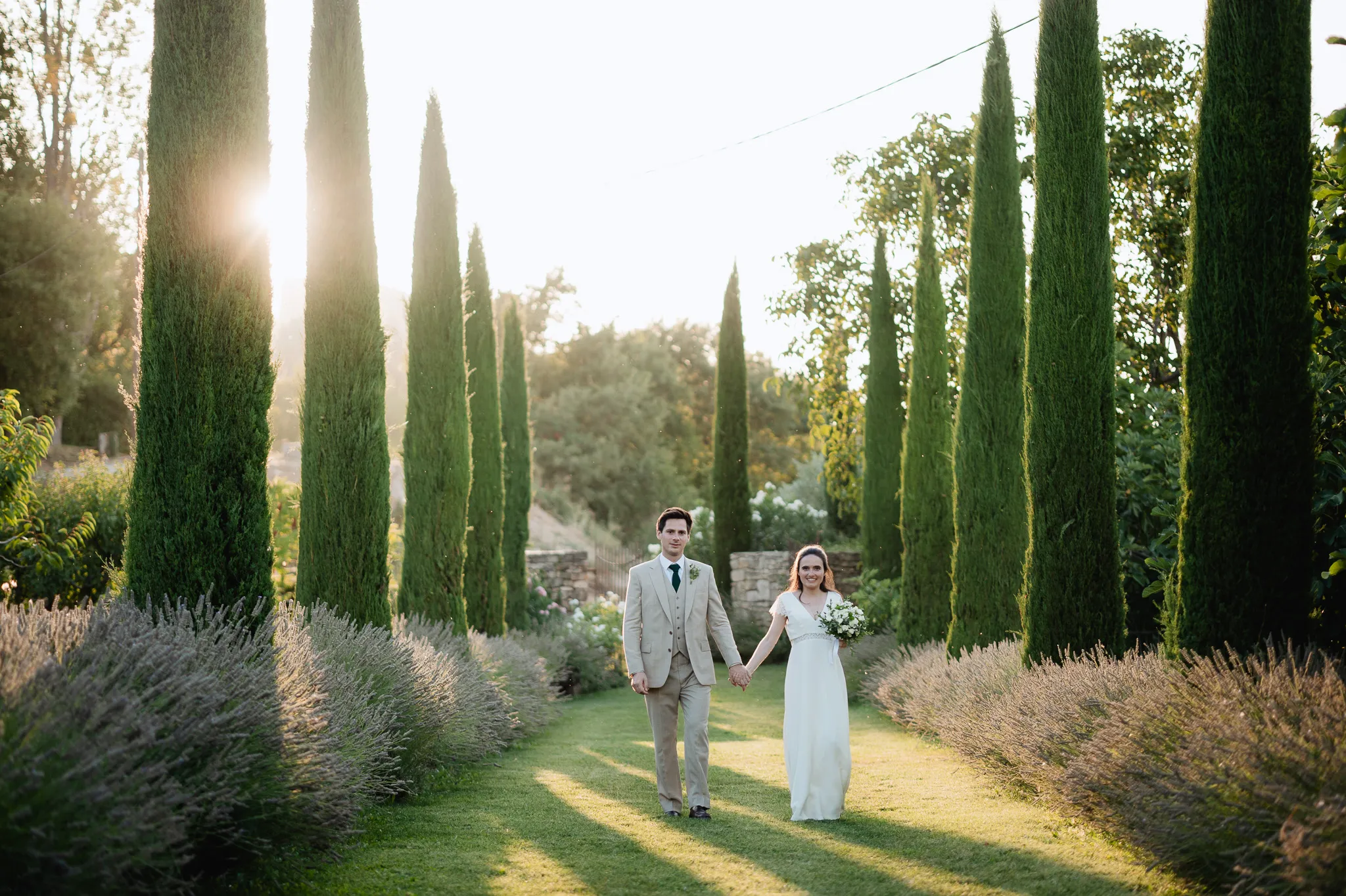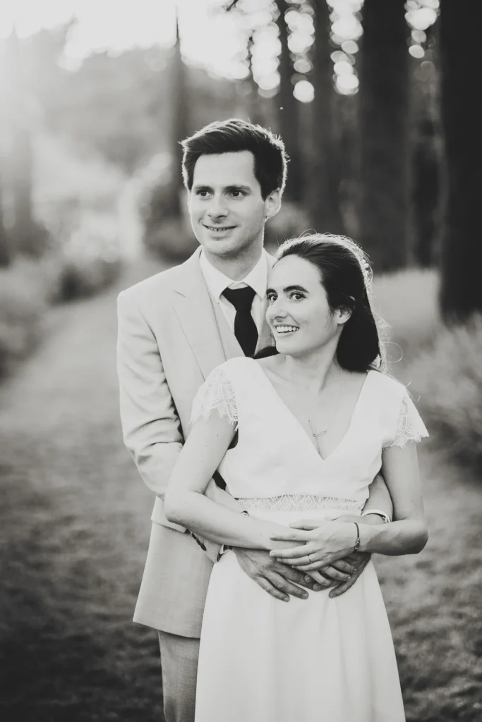 À l’Abbaye de Saint-Eusèbe, tout commence dehors : une arrivée progressive des invités, puis cette ambiance très particulière du lieu, avec l’allée de cyprès et les lavandes qui bordent les jardins. La cérémonie laïque se tient en extérieur, sur la pelouse, dans une atmosphère simple et attentive, on sent que l’endroit est pensé pour laisser de la place aux voix, aux regards et aux silences. Après la cérémonie, le cocktail se prolonge dans les jardins, à l’ombre des cyprès, pendant que les groupes se forment et se défont naturellement. C’est aussi le moment idéal pour la séance couple : quelques minutes à l’écart, entre cyprès, lavande et pierre claire, avec une lumière de fin de journée qui se glisse entre les arbres et donne aux images un côté très doux, sans avoir besoin d’en faire trop. Le repas se déroule ensuite à l’intérieur de l’abbaye, dans un espace marqué par la pierre et les voûtes — un décor qui change immédiatement le rythme : plus posé, plus intime, très “abbaye”. Puis la soirée bascule dans un espace voûté plus souterrain (type crypte), parfait pour la fête : lumière plus basse, boule à facettes, et cette sensation d’être “dans” le lieu, jusqu’au bout de la nuit.