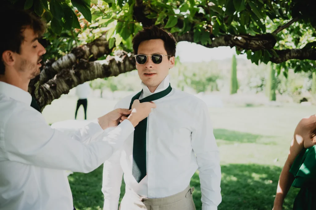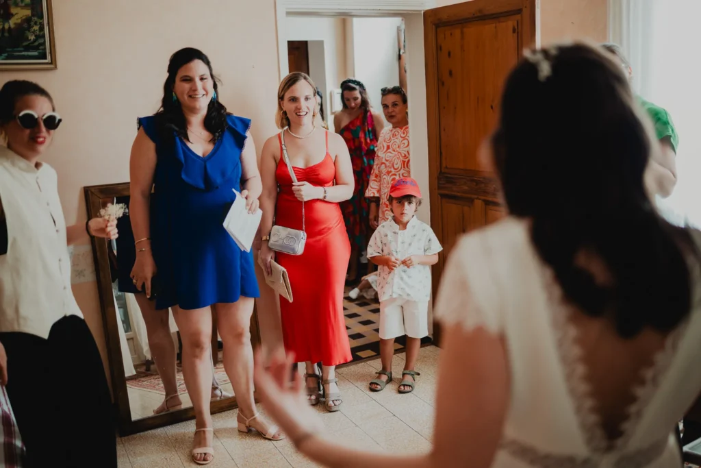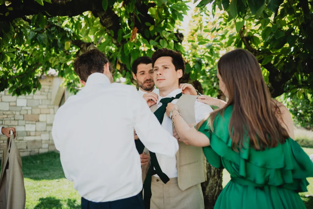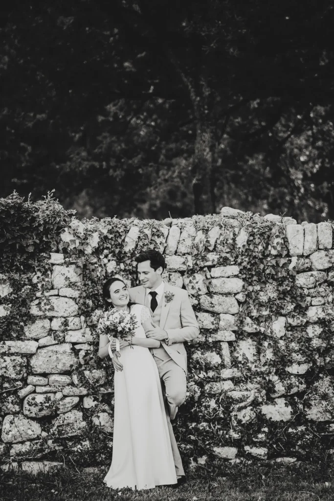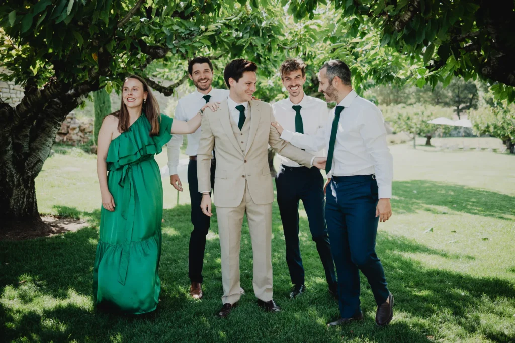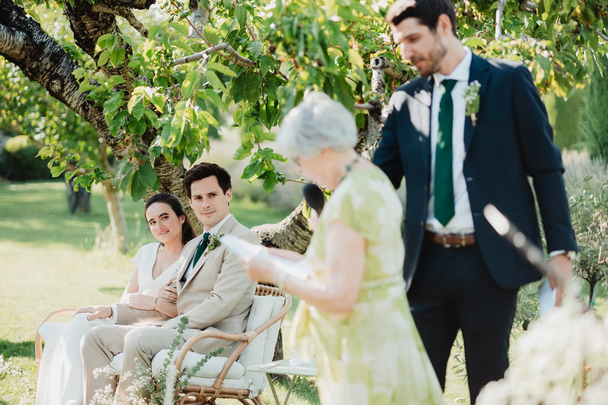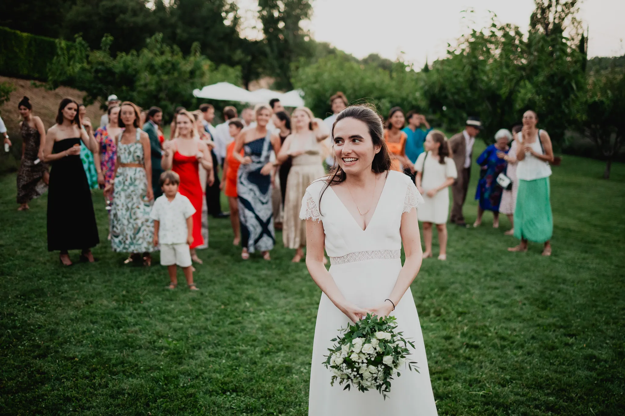 À l’Abbaye de Saint-Eusèbe, tout commence dehors : une arrivée progressive des invités, puis cette ambiance très particulière du lieu, avec l’allée de cyprès et les lavandes qui bordent les jardins. La cérémonie laïque se tient en extérieur, sur la pelouse, dans une atmosphère simple et attentive, on sent que l’endroit est pensé pour laisser de la place aux voix, aux regards et aux silences. Après la cérémonie, le cocktail se prolonge dans les jardins, à l’ombre des cyprès, pendant que les groupes se forment et se défont naturellement. C’est aussi le moment idéal pour la séance couple : quelques minutes à l’écart, entre cyprès, lavande et pierre claire, avec une lumière de fin de journée qui se glisse entre les arbres et donne aux images un côté très doux, sans avoir besoin d’en faire trop. Le repas se déroule ensuite à l’intérieur de l’abbaye, dans un espace marqué par la pierre et les voûtes — un décor qui change immédiatement le rythme : plus posé, plus intime, très “abbaye”. Puis la soirée bascule dans un espace voûté plus souterrain (type crypte), parfait pour la fête : lumière plus basse, boule à facettes, et cette sensation d’être “dans” le lieu, jusqu’au bout de la nuit.