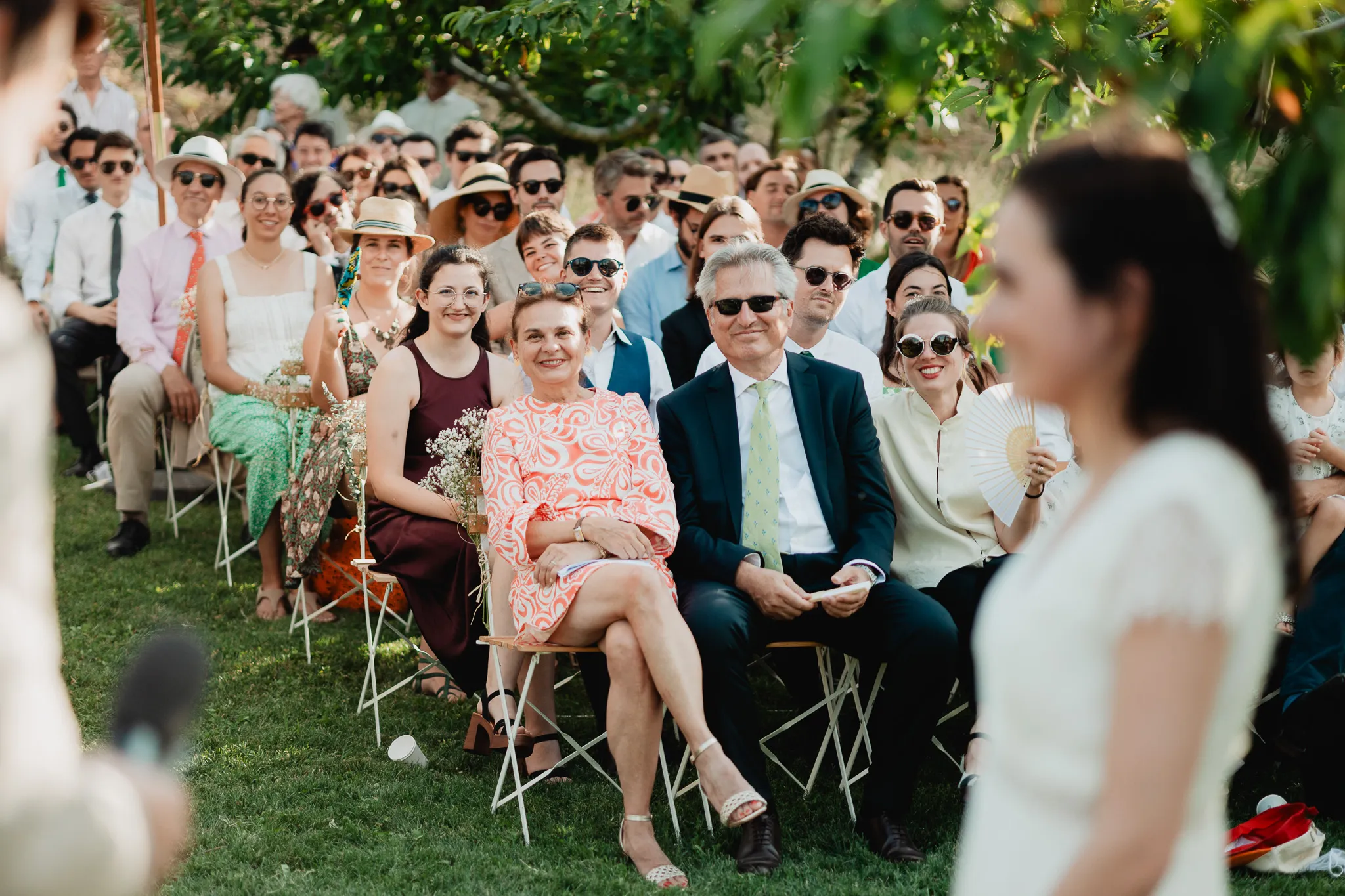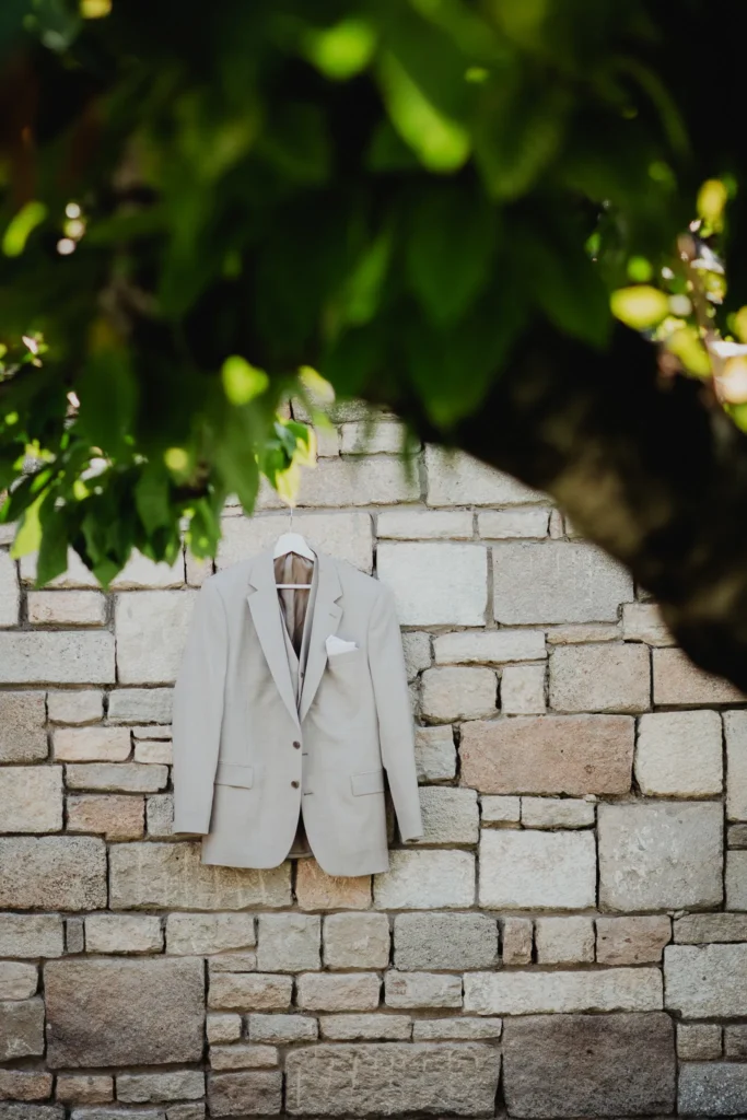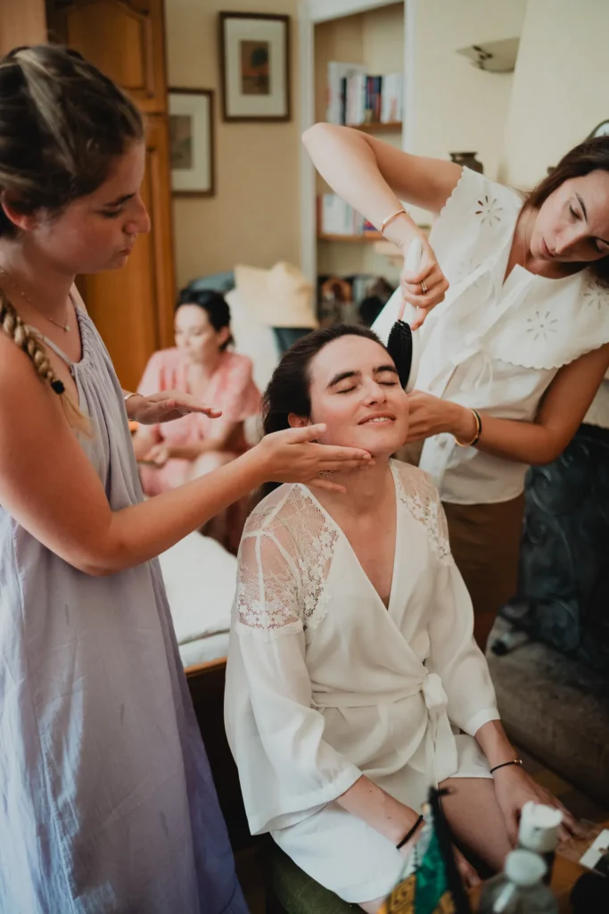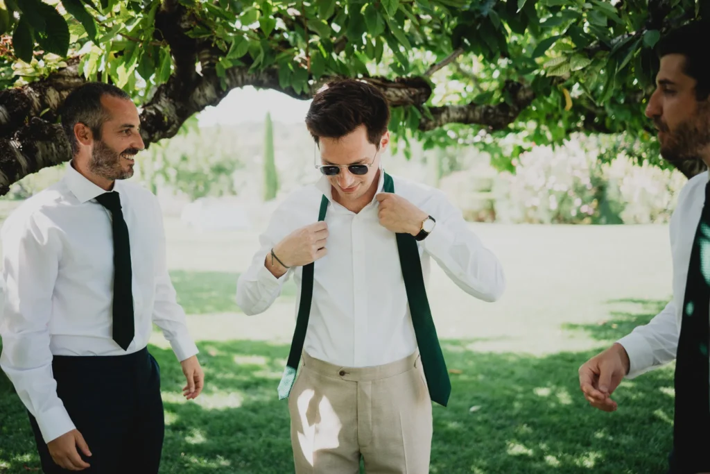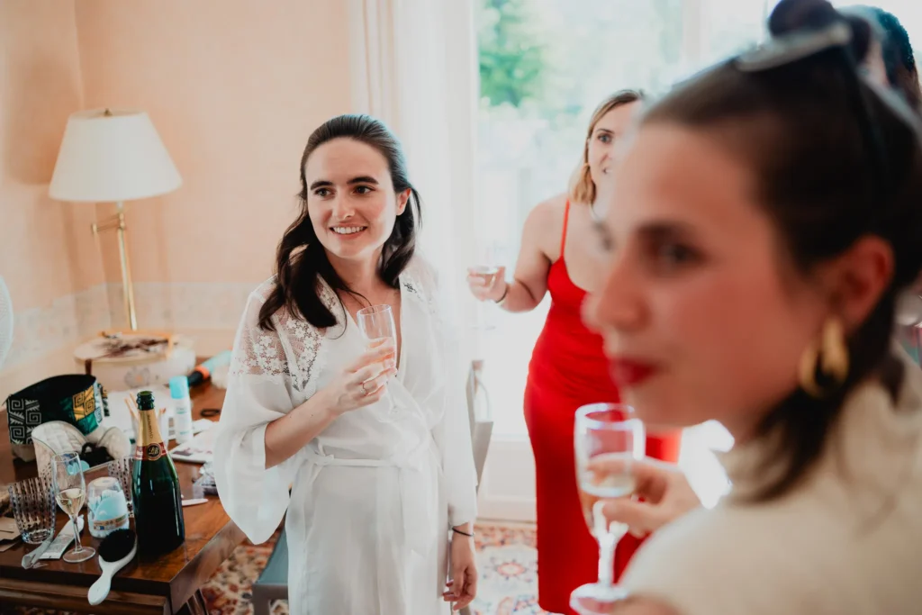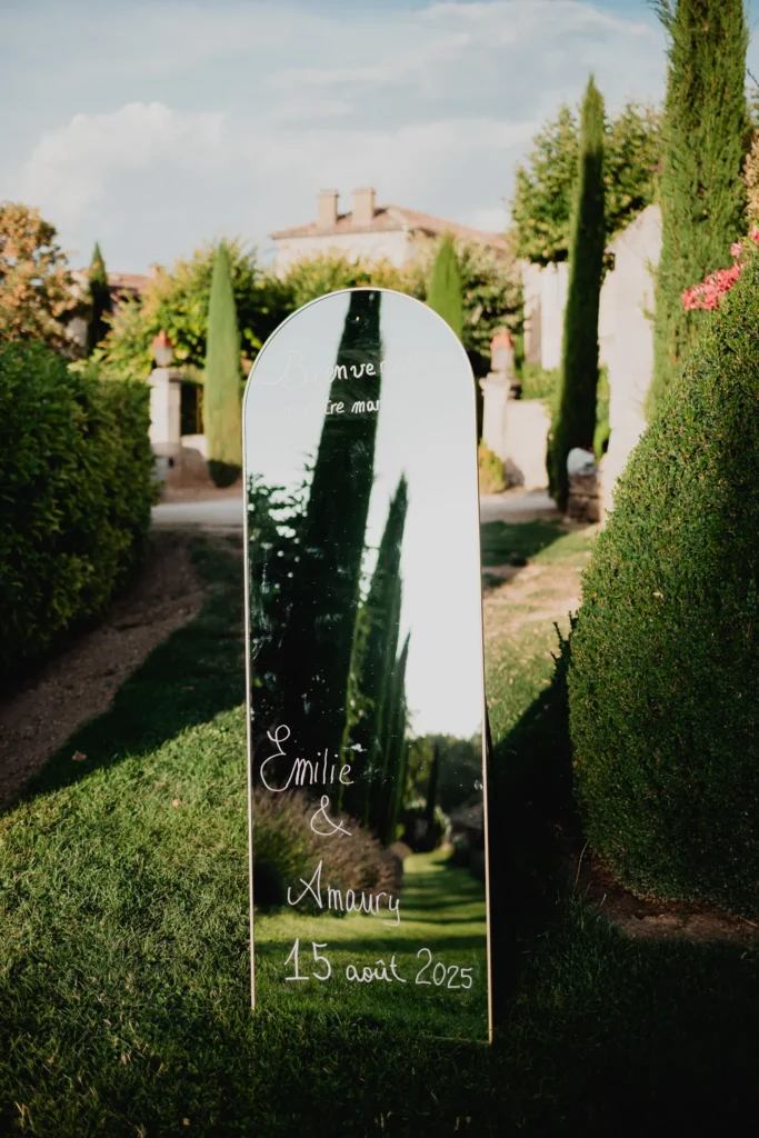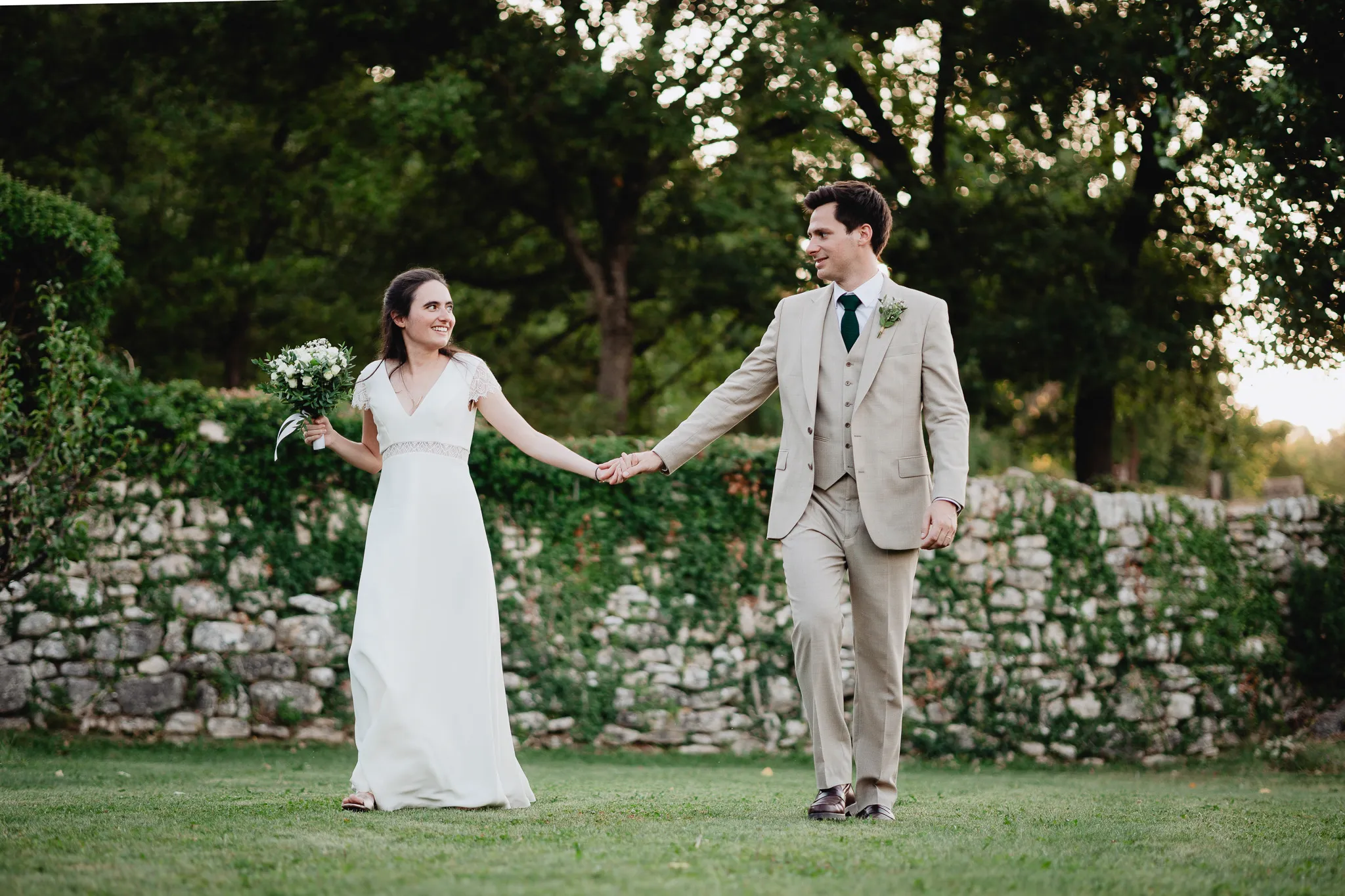 À l’Abbaye de Saint-Eusèbe, tout commence dehors : une arrivée progressive des invités, puis cette ambiance très particulière du lieu, avec l’allée de cyprès et les lavandes qui bordent les jardins. La cérémonie laïque se tient en extérieur, sur la pelouse, dans une atmosphère simple et attentive, on sent que l’endroit est pensé pour laisser de la place aux voix, aux regards et aux silences. Après la cérémonie, le cocktail se prolonge dans les jardins, à l’ombre des cyprès, pendant que les groupes se forment et se défont naturellement. C’est aussi le moment idéal pour la séance couple : quelques minutes à l’écart, entre cyprès, lavande et pierre claire, avec une lumière de fin de journée qui se glisse entre les arbres et donne aux images un côté très doux, sans avoir besoin d’en faire trop. Le repas se déroule ensuite à l’intérieur de l’abbaye, dans un espace marqué par la pierre et les voûtes — un décor qui change immédiatement le rythme : plus posé, plus intime, très “abbaye”. Puis la soirée bascule dans un espace voûté plus souterrain (type crypte), parfait pour la fête : lumière plus basse, boule à facettes, et cette sensation d’être “dans” le lieu, jusqu’au bout de la nuit.