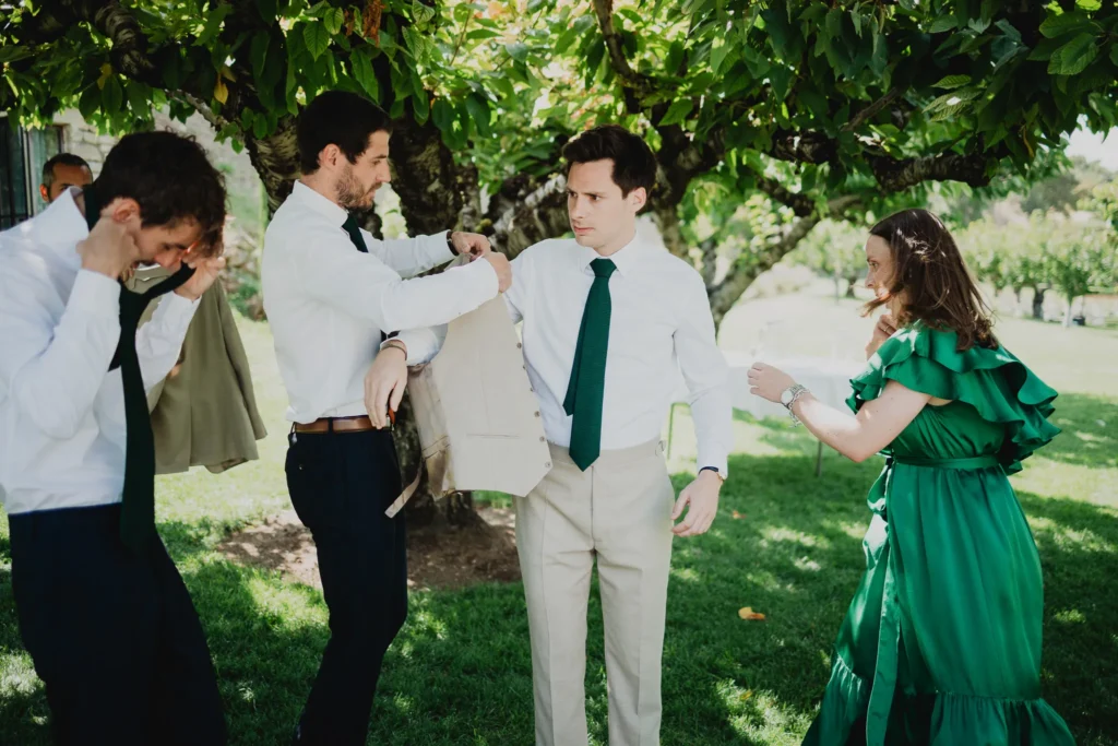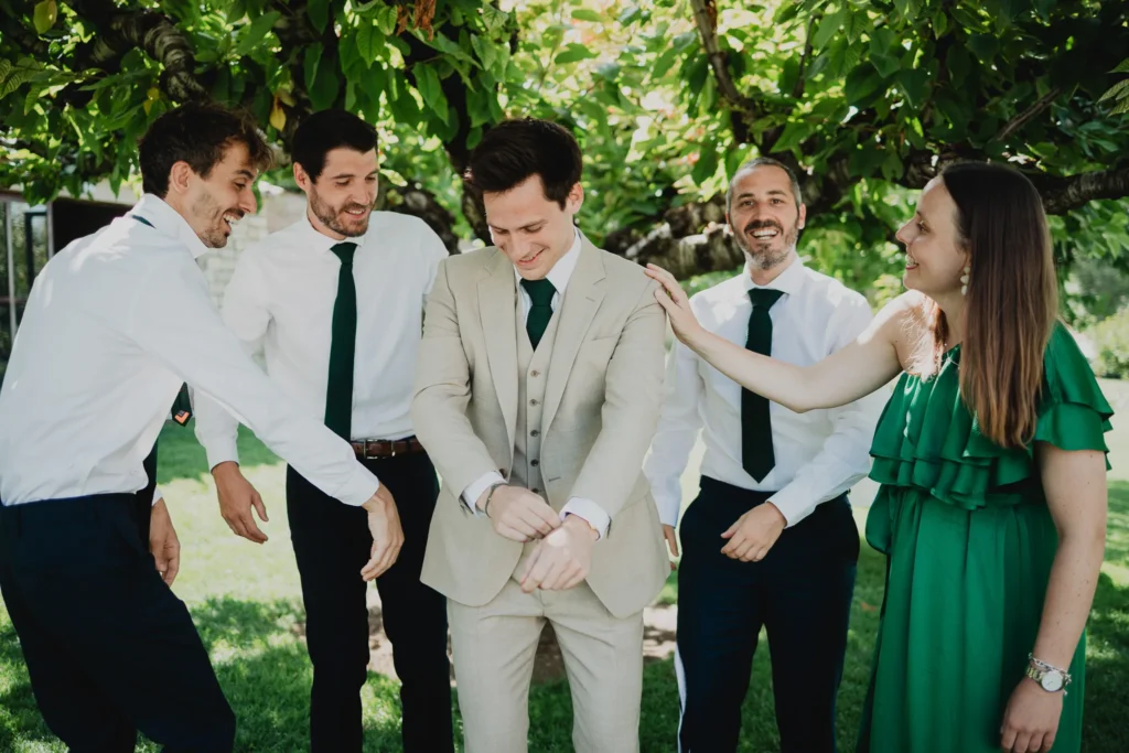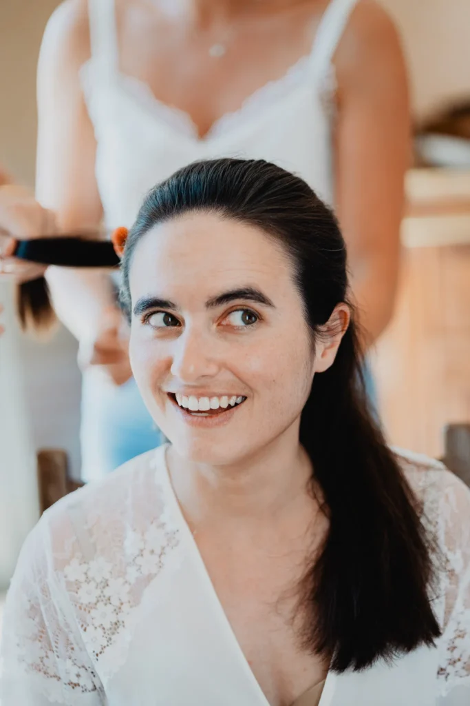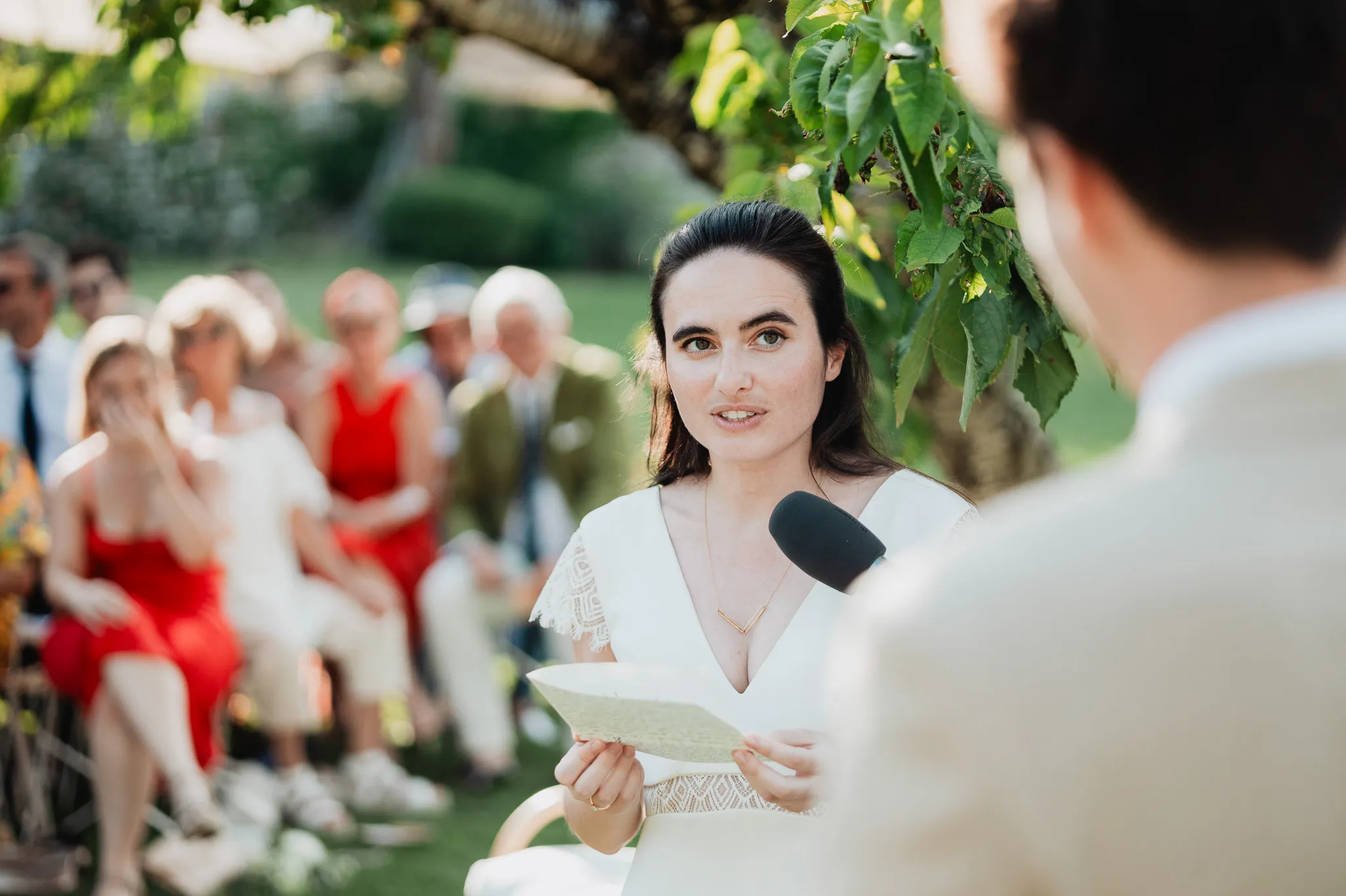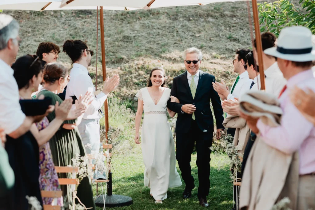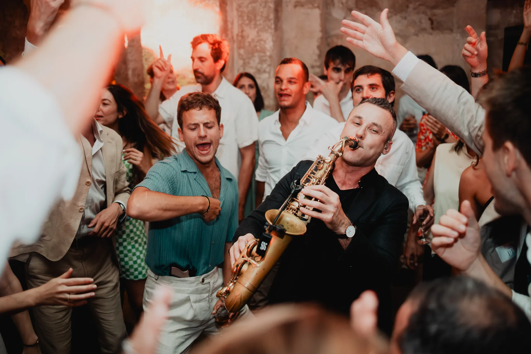 À l’Abbaye de Saint-Eusèbe, tout commence dehors : une arrivée progressive des invités, puis cette ambiance très particulière du lieu, avec l’allée de cyprès et les lavandes qui bordent les jardins. La cérémonie laïque se tient en extérieur, sur la pelouse, dans une atmosphère simple et attentive, on sent que l’endroit est pensé pour laisser de la place aux voix, aux regards et aux silences. Après la cérémonie, le cocktail se prolonge dans les jardins, à l’ombre des cyprès, pendant que les groupes se forment et se défont naturellement. C’est aussi le moment idéal pour la séance couple : quelques minutes à l’écart, entre cyprès, lavande et pierre claire, avec une lumière de fin de journée qui se glisse entre les arbres et donne aux images un côté très doux, sans avoir besoin d’en faire trop. Le repas se déroule ensuite à l’intérieur de l’abbaye, dans un espace marqué par la pierre et les voûtes — un décor qui change immédiatement le rythme : plus posé, plus intime, très “abbaye”. Puis la soirée bascule dans un espace voûté plus souterrain (type crypte), parfait pour la fête : lumière plus basse, boule à facettes, et cette sensation d’être “dans” le lieu, jusqu’au bout de la nuit.
