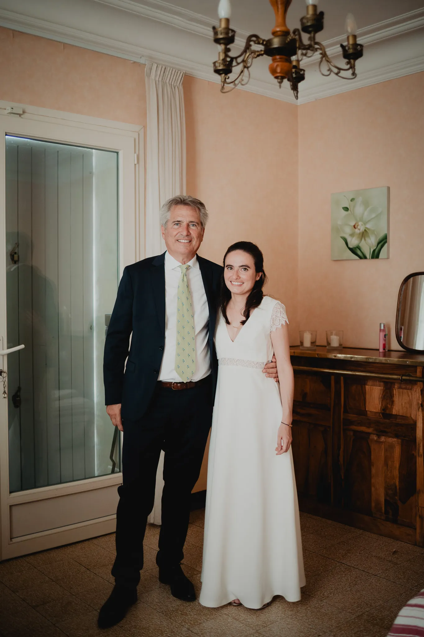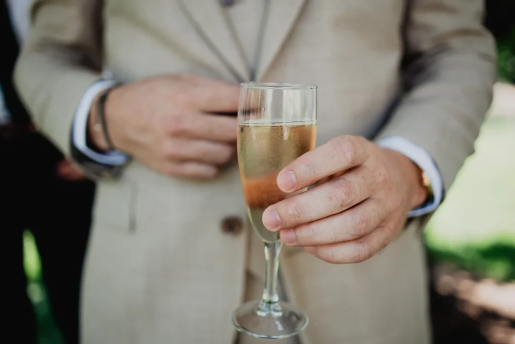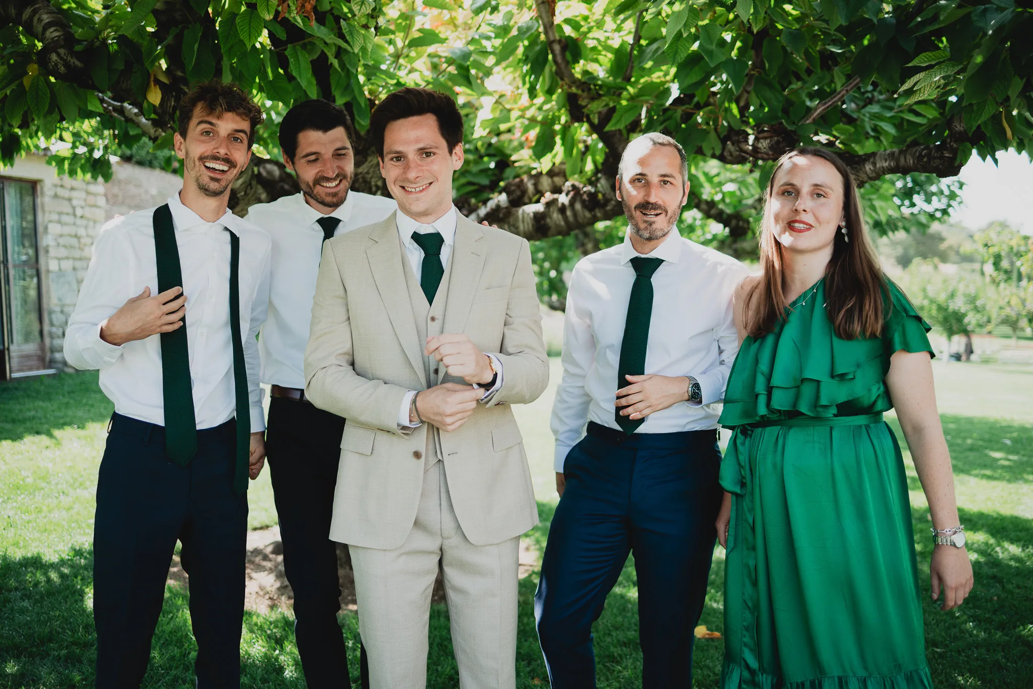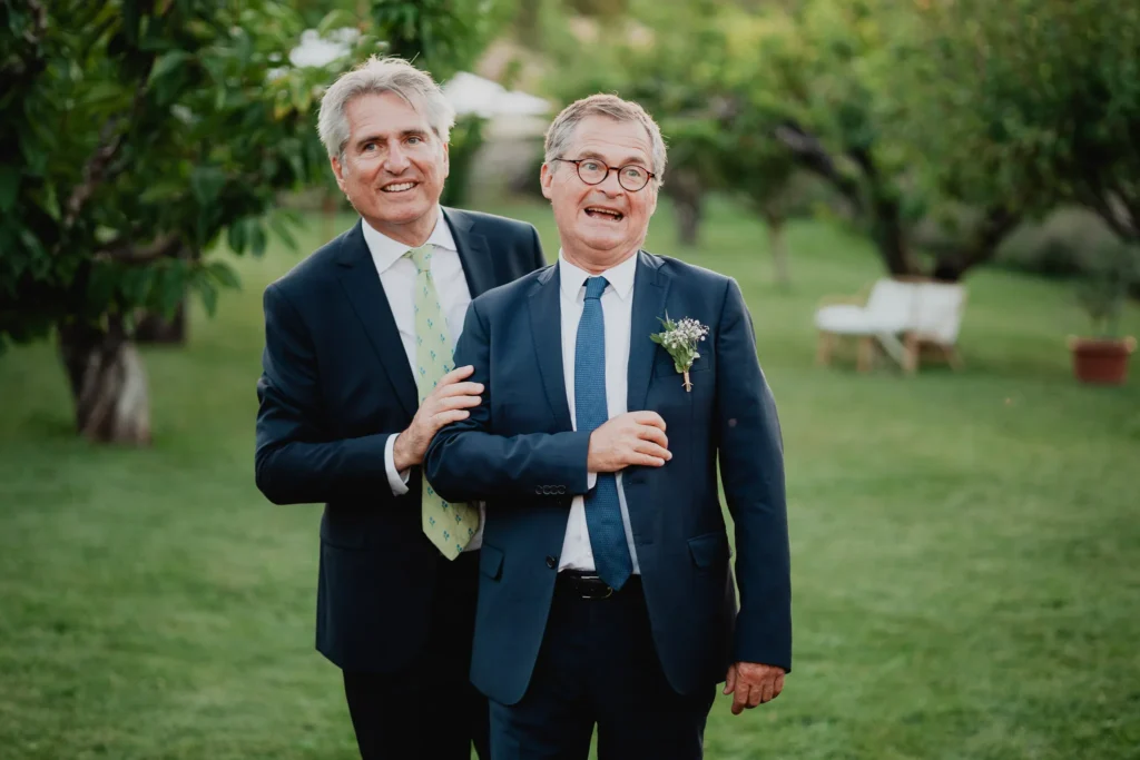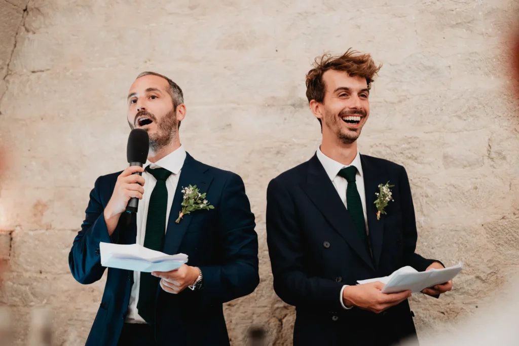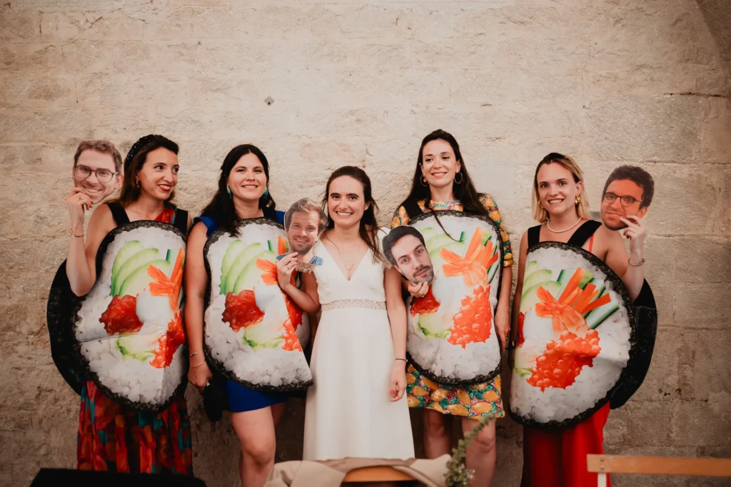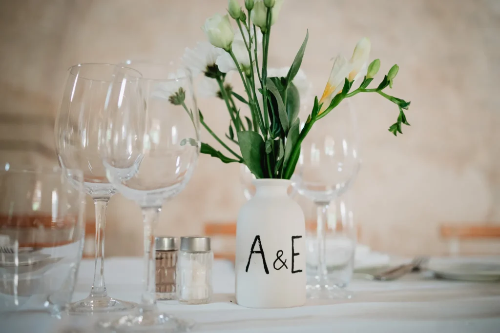 À l’Abbaye de Saint-Eusèbe, tout commence dehors : une arrivée progressive des invités, puis cette ambiance très particulière du lieu, avec l’allée de cyprès et les lavandes qui bordent les jardins. La cérémonie laïque se tient en extérieur, sur la pelouse, dans une atmosphère simple et attentive, on sent que l’endroit est pensé pour laisser de la place aux voix, aux regards et aux silences. Après la cérémonie, le cocktail se prolonge dans les jardins, à l’ombre des cyprès, pendant que les groupes se forment et se défont naturellement. C’est aussi le moment idéal pour la séance couple : quelques minutes à l’écart, entre cyprès, lavande et pierre claire, avec une lumière de fin de journée qui se glisse entre les arbres et donne aux images un côté très doux, sans avoir besoin d’en faire trop. Le repas se déroule ensuite à l’intérieur de l’abbaye, dans un espace marqué par la pierre et les voûtes — un décor qui change immédiatement le rythme : plus posé, plus intime, très “abbaye”. Puis la soirée bascule dans un espace voûté plus souterrain (type crypte), parfait pour la fête : lumière plus basse, boule à facettes, et cette sensation d’être “dans” le lieu, jusqu’au bout de la nuit.