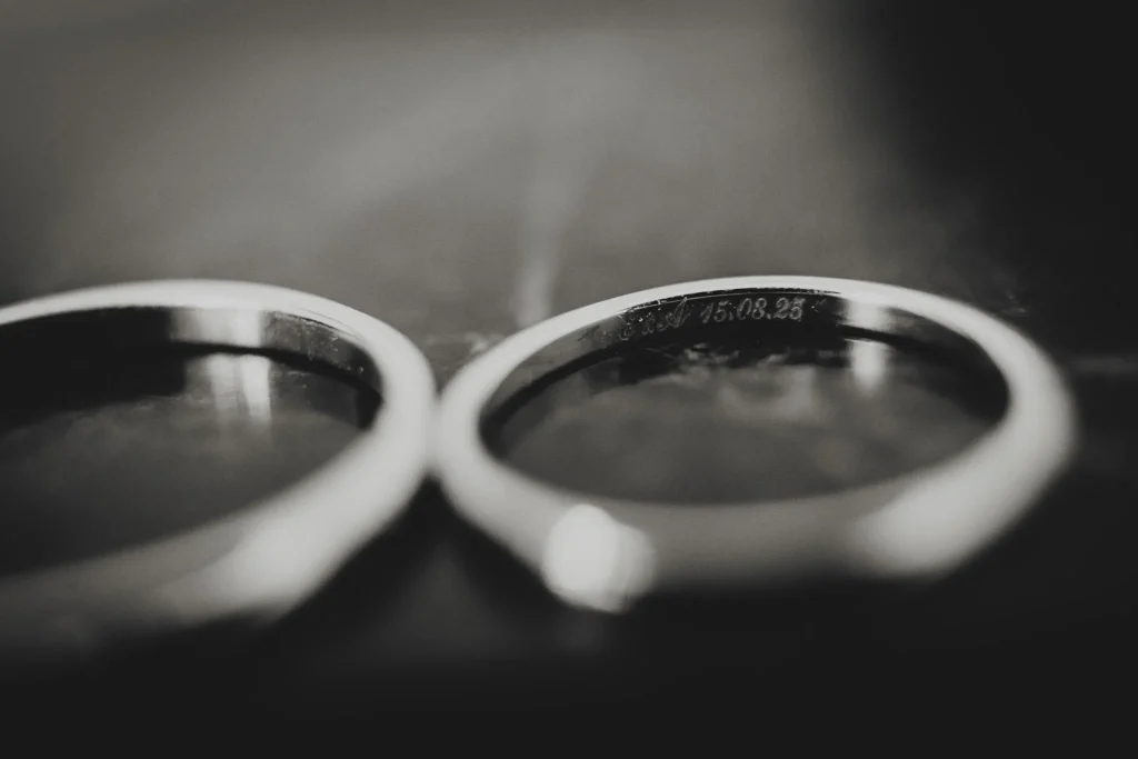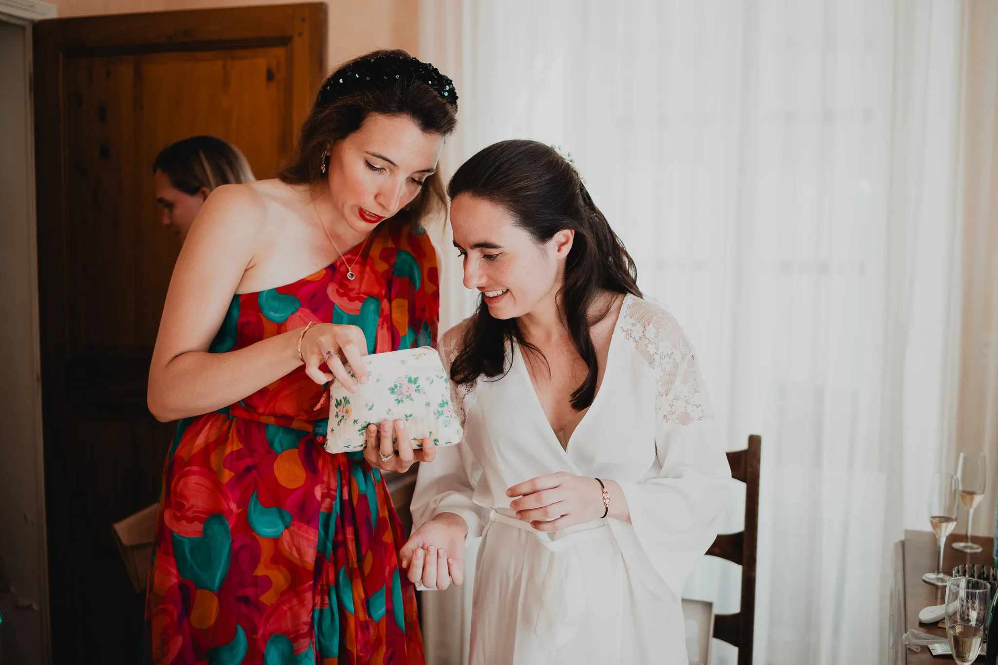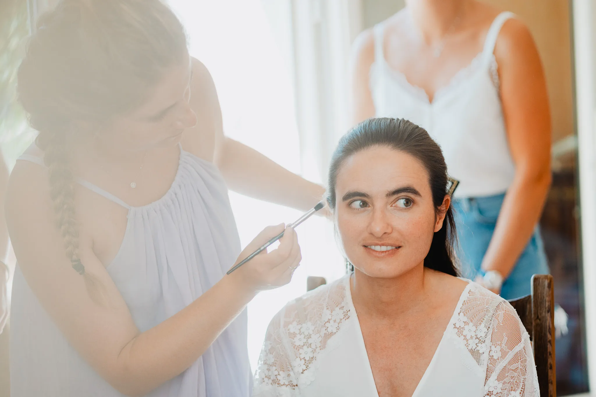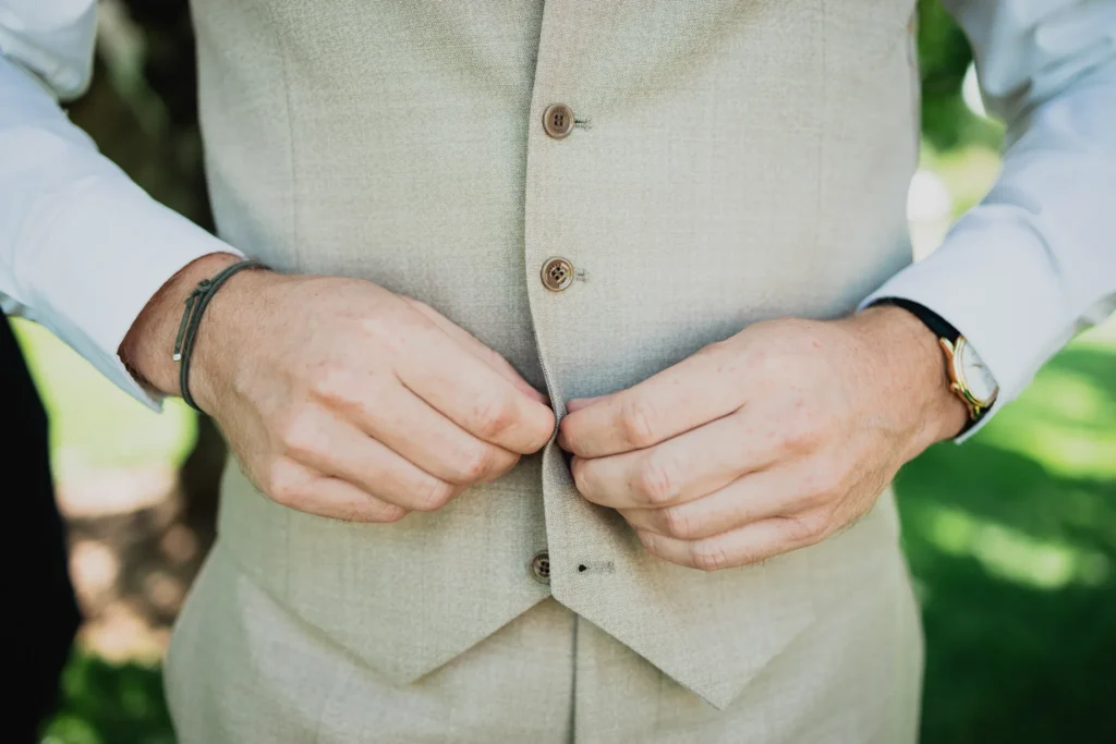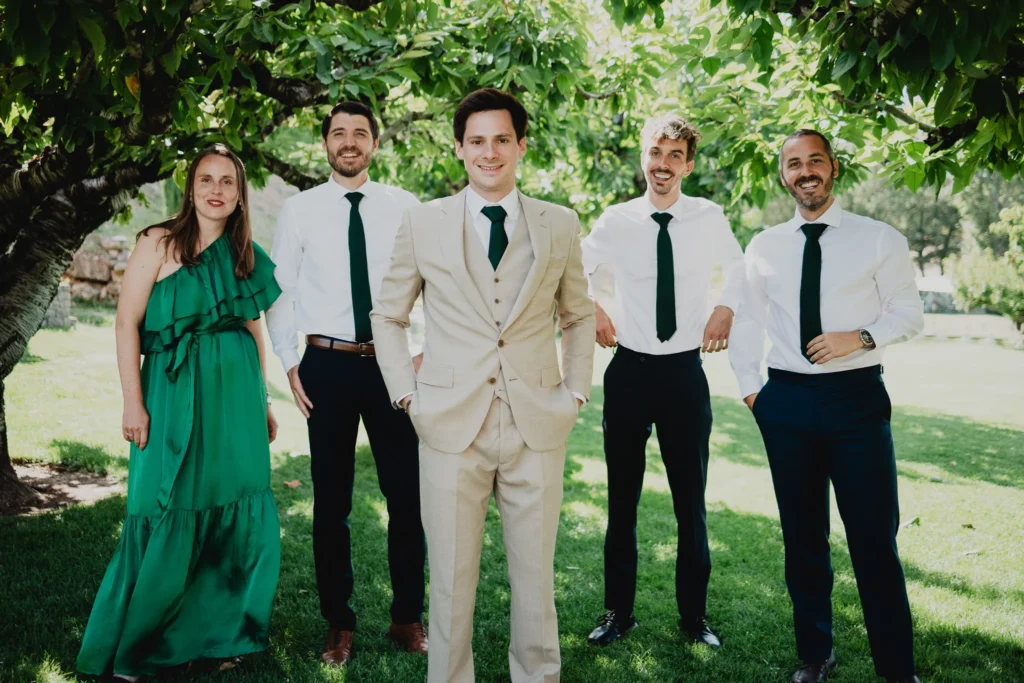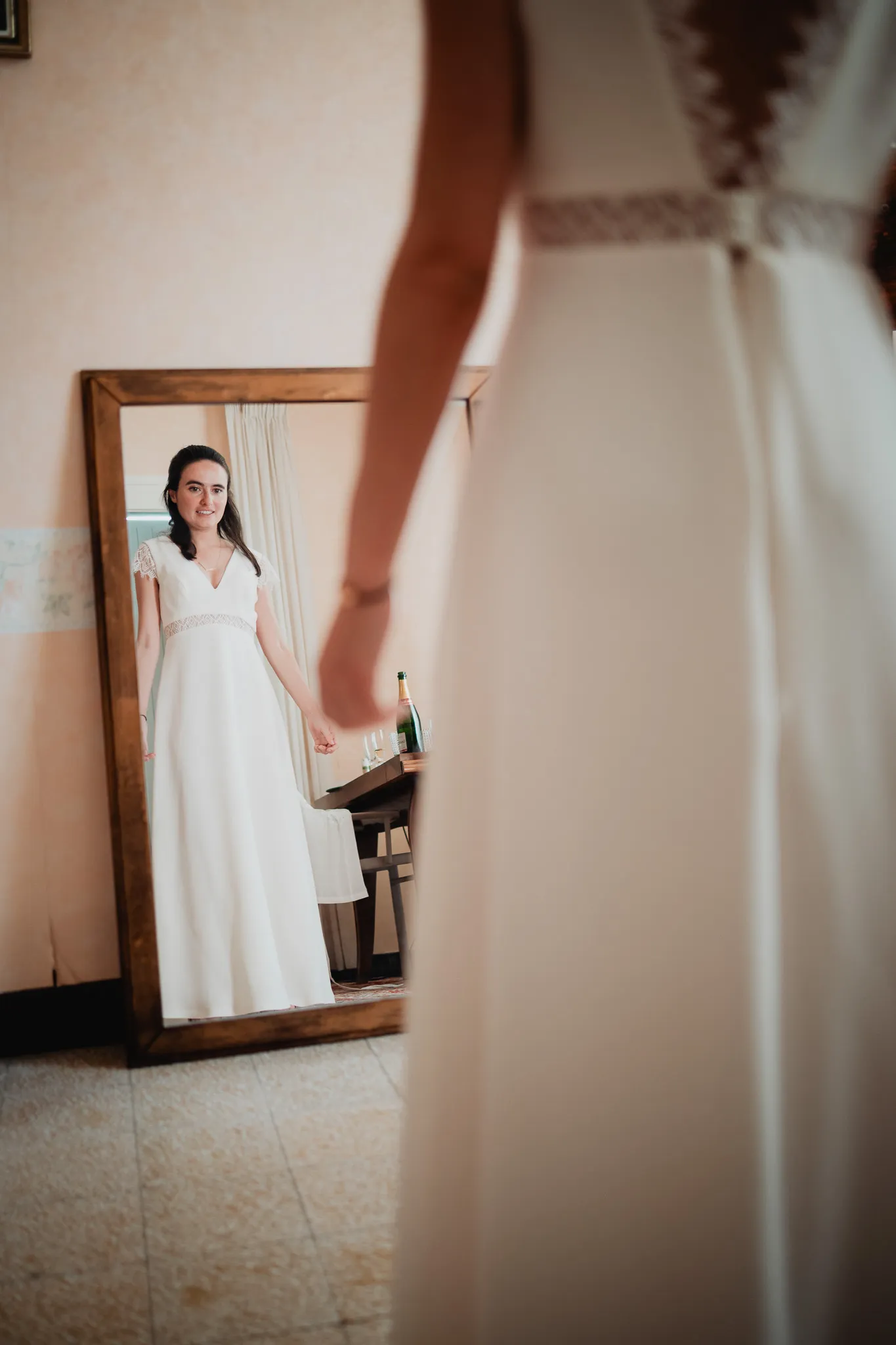 À l’Abbaye de Saint-Eusèbe, tout commence dehors : une arrivée progressive des invités, puis cette ambiance très particulière du lieu, avec l’allée de cyprès et les lavandes qui bordent les jardins. La cérémonie laïque se tient en extérieur, sur la pelouse, dans une atmosphère simple et attentive, on sent que l’endroit est pensé pour laisser de la place aux voix, aux regards et aux silences. Après la cérémonie, le cocktail se prolonge dans les jardins, à l’ombre des cyprès, pendant que les groupes se forment et se défont naturellement. C’est aussi le moment idéal pour la séance couple : quelques minutes à l’écart, entre cyprès, lavande et pierre claire, avec une lumière de fin de journée qui se glisse entre les arbres et donne aux images un côté très doux, sans avoir besoin d’en faire trop. Le repas se déroule ensuite à l’intérieur de l’abbaye, dans un espace marqué par la pierre et les voûtes — un décor qui change immédiatement le rythme : plus posé, plus intime, très “abbaye”. Puis la soirée bascule dans un espace voûté plus souterrain (type crypte), parfait pour la fête : lumière plus basse, boule à facettes, et cette sensation d’être “dans” le lieu, jusqu’au bout de la nuit.