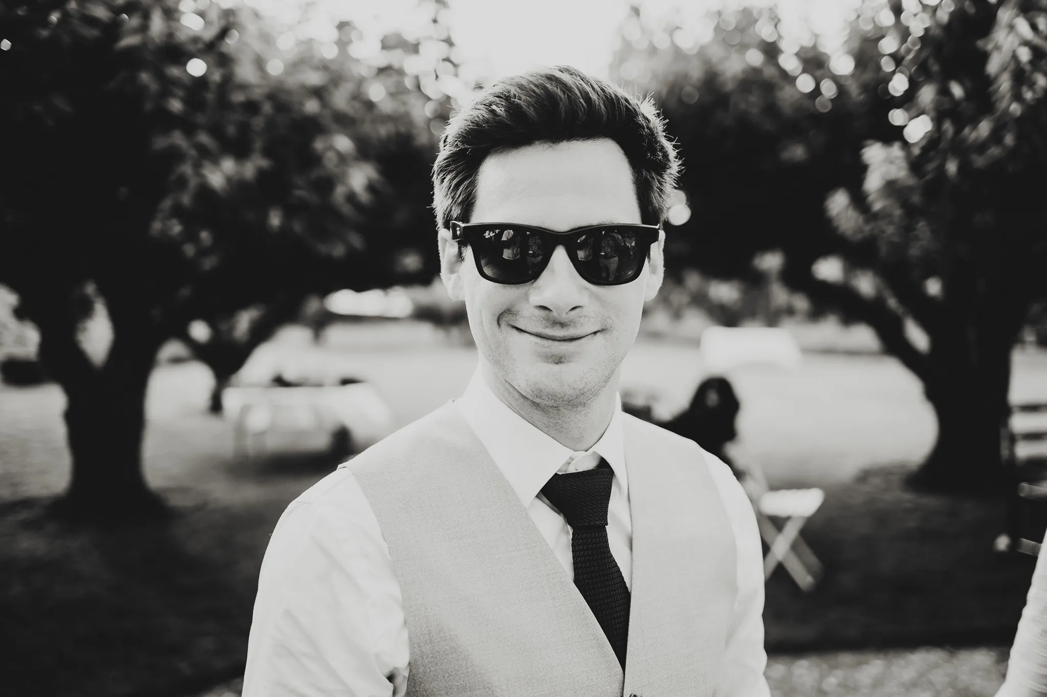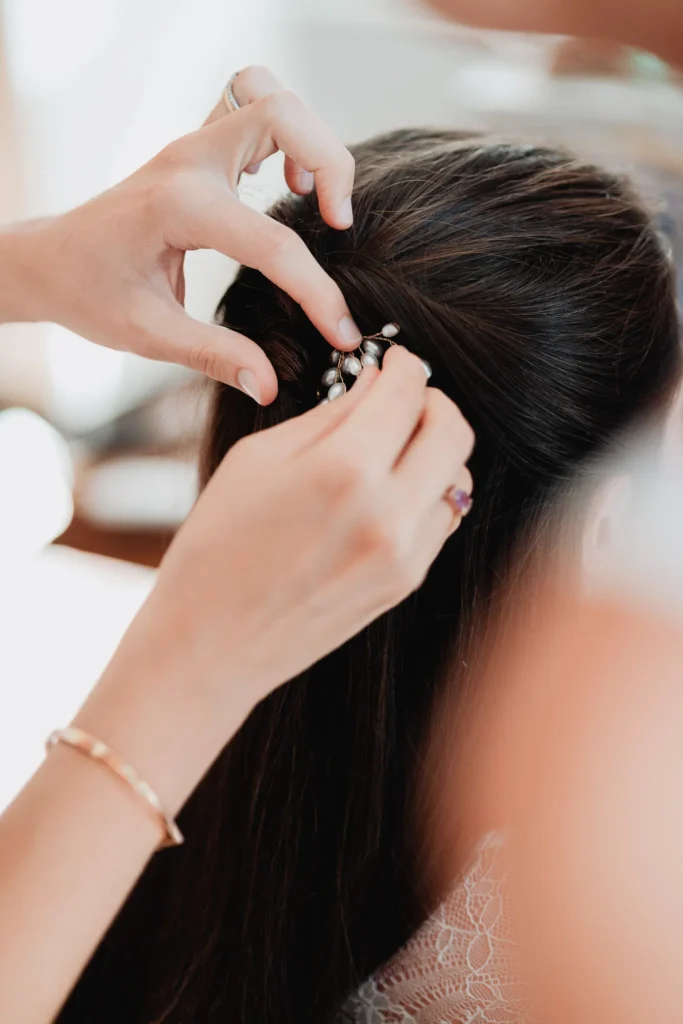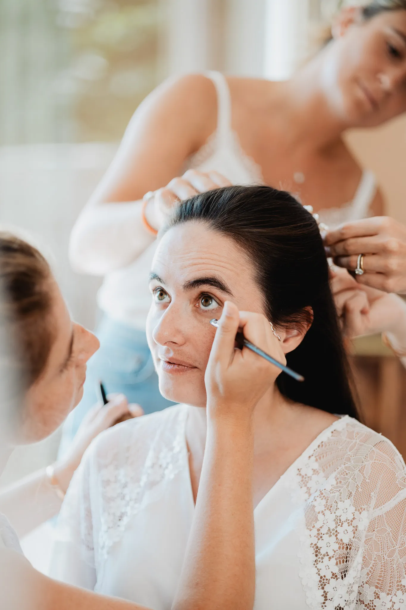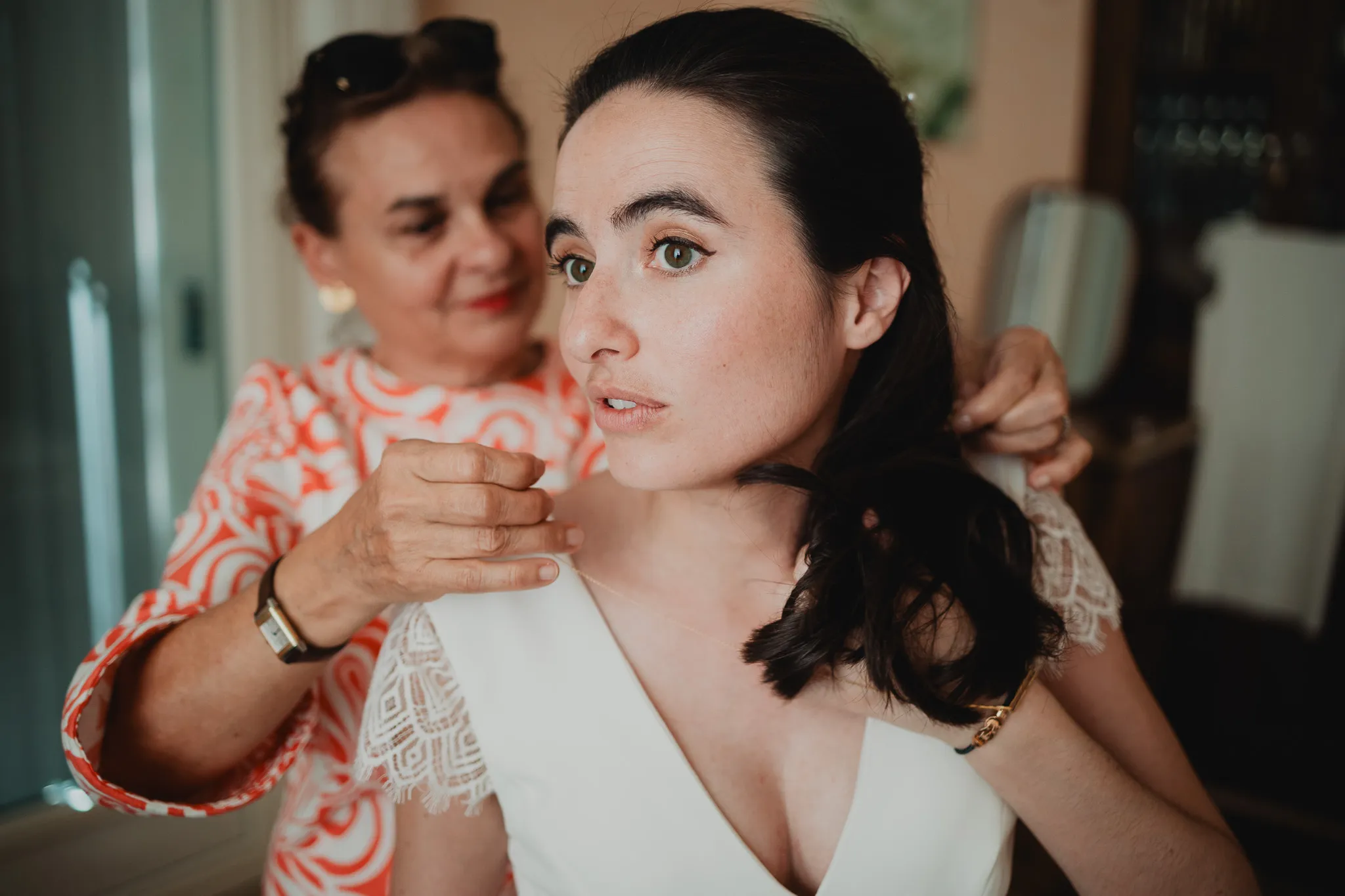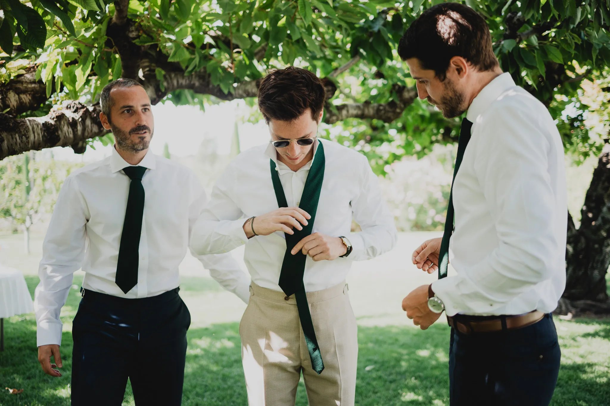 À l’Abbaye de Saint-Eusèbe, tout commence dehors : une arrivée progressive des invités, puis cette ambiance très particulière du lieu, avec l’allée de cyprès et les lavandes qui bordent les jardins. La cérémonie laïque se tient en extérieur, sur la pelouse, dans une atmosphère simple et attentive, on sent que l’endroit est pensé pour laisser de la place aux voix, aux regards et aux silences. Après la cérémonie, le cocktail se prolonge dans les jardins, à l’ombre des cyprès, pendant que les groupes se forment et se défont naturellement. C’est aussi le moment idéal pour la séance couple : quelques minutes à l’écart, entre cyprès, lavande et pierre claire, avec une lumière de fin de journée qui se glisse entre les arbres et donne aux images un côté très doux, sans avoir besoin d’en faire trop. Le repas se déroule ensuite à l’intérieur de l’abbaye, dans un espace marqué par la pierre et les voûtes — un décor qui change immédiatement le rythme : plus posé, plus intime, très “abbaye”. Puis la soirée bascule dans un espace voûté plus souterrain (type crypte), parfait pour la fête : lumière plus basse, boule à facettes, et cette sensation d’être “dans” le lieu, jusqu’au bout de la nuit.