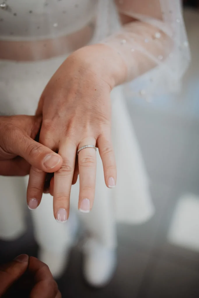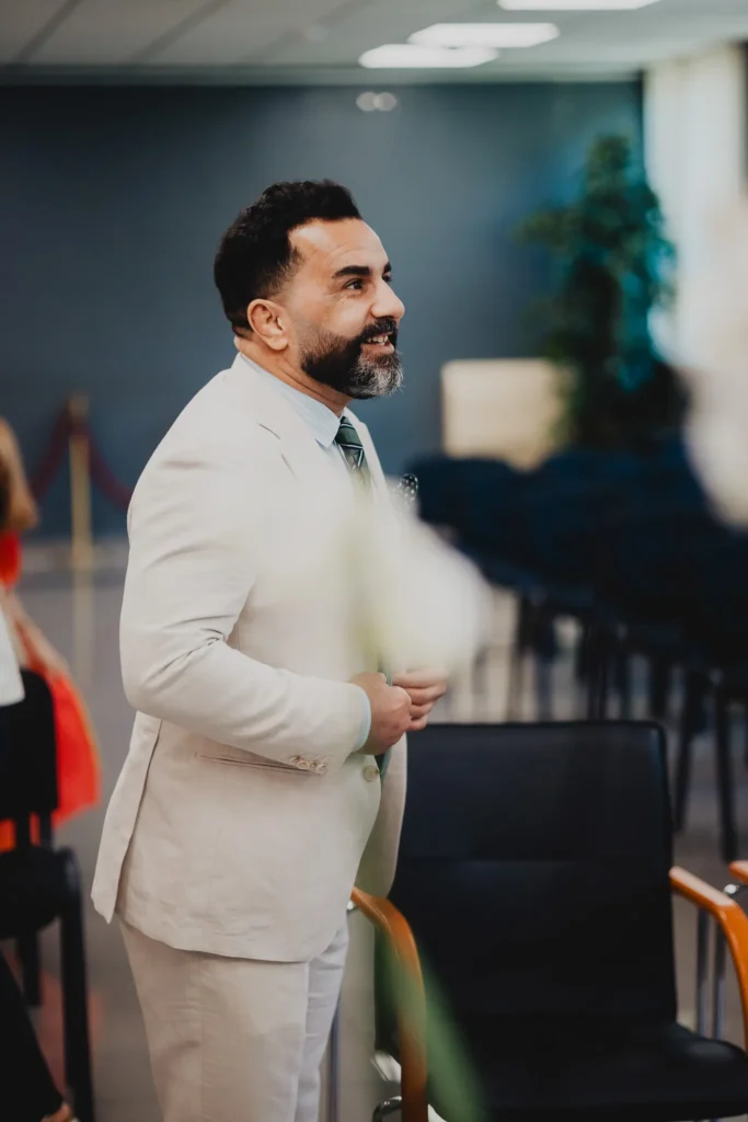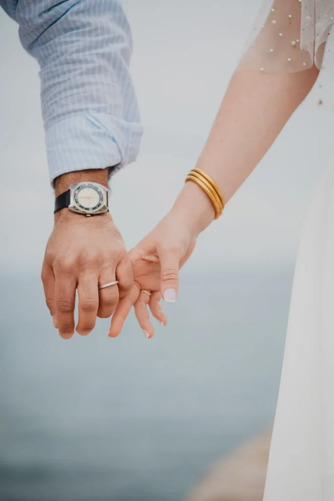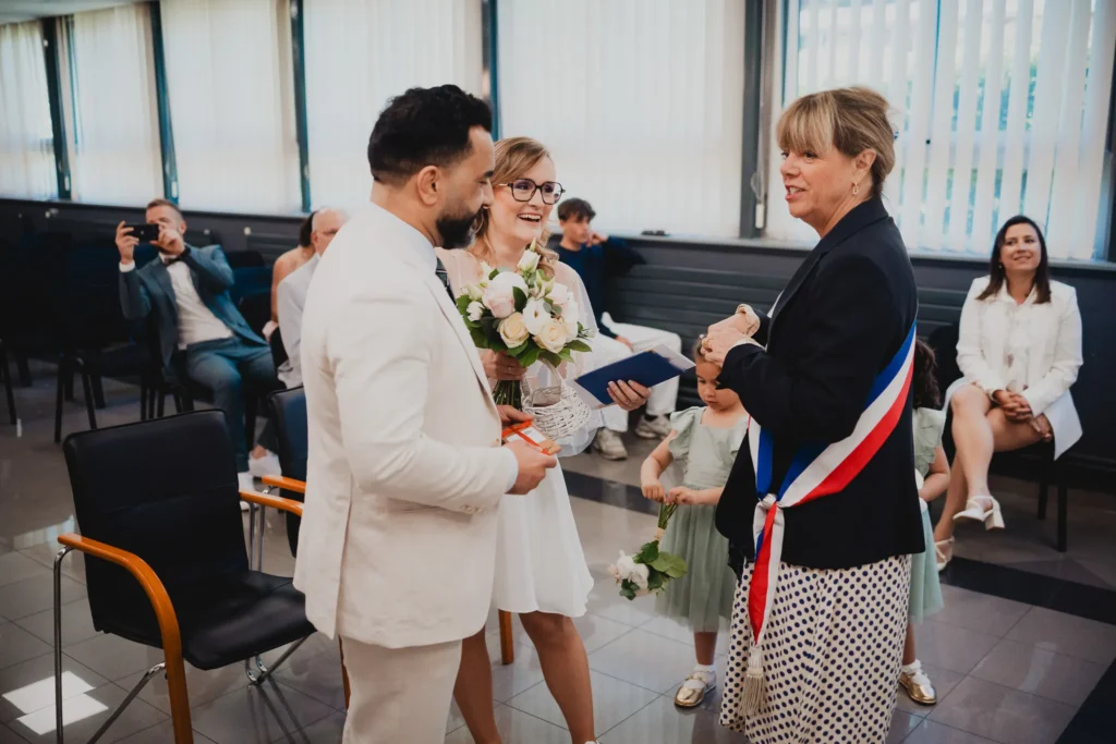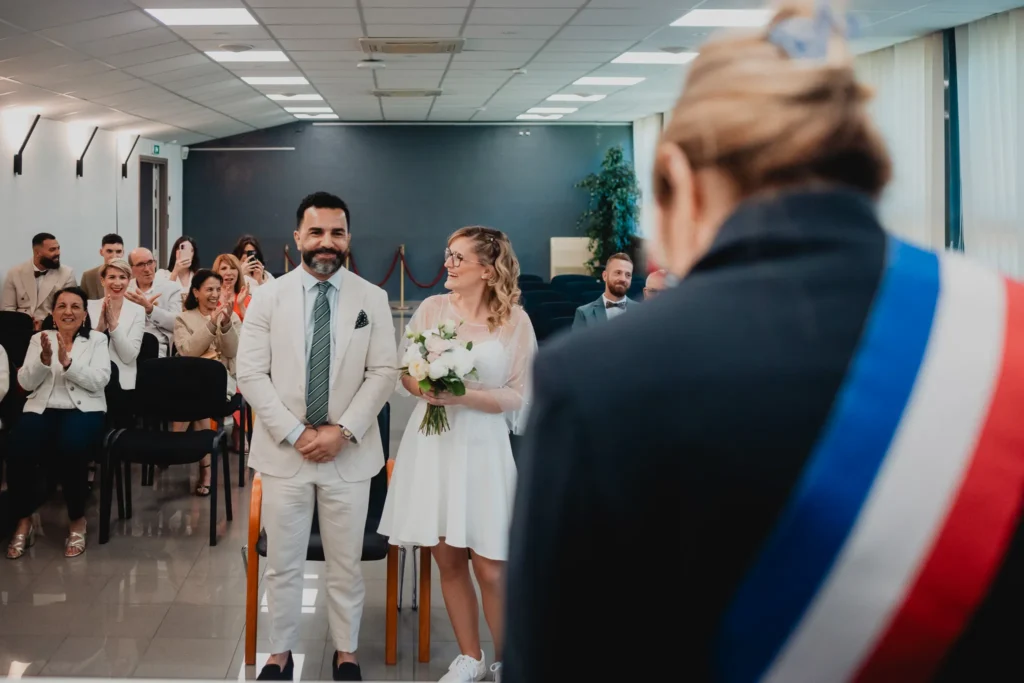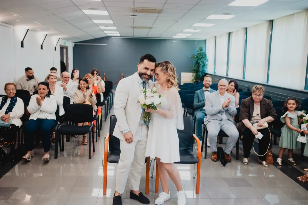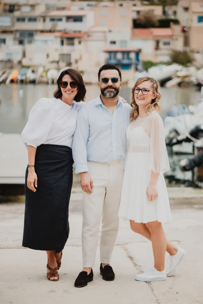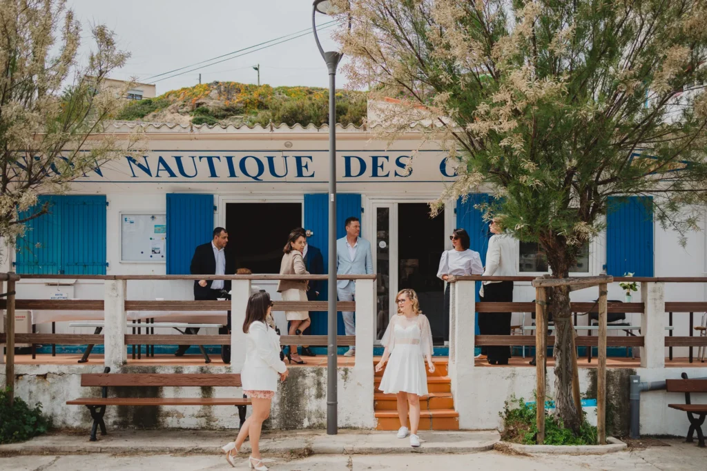 Après la cérémonie civile à la mairie des 11ᵉ et 12ᵉ arrondissements, les invités ont rejoint les Goudes, à l’extrémité sud de Marseille. Ce passage de la ville au bord de mer donne un rythme particulier à la journée, entre solennité du moment officiel et détente face au large. L’Union Nautique des Goudes offre un cadre unique pour un vin d’honneur à Marseille : une terrasse ouverte sur la mer, un village préservé et une lumière qui évolue au fil des heures. Le vent et l’atmosphère du village ont accompagné cette journée simple et chaleureuse. Autant d’éléments qui participent à l’atmosphère du mariage et à la manière dont il se raconte en images.